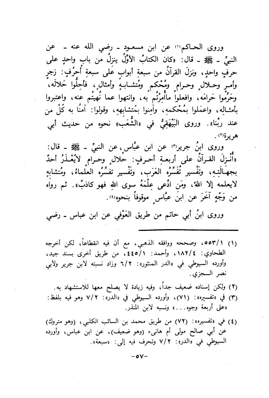 وروى ابْن جرير عَن ابْن عَبَّاس عَن النَّبِي صلى الله عَلَيْهِ وَسلم قَالَ أنزل الْقُرْآن على أَرْبَعَة أحرف حَلَال وَحرَام لَا يعْذر أحد بجهالته وَتَفْسِير تفسره الْعَرَب وَتَفْسِير تفسره الْعلمَاء ومتشابه لَا يُعلمهُ إِلَّا الله وَمن ادّعى علمه سوى الله فَهُوَ كَاذِب ثمَّ رَوَاهُ من وَجه آخر عَن ابْن عَبَّاس مَوْقُوفا بِنَحْوِهِ