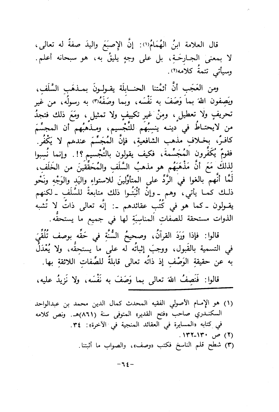 وَمن الْعجب أَن أَئِمَّتنَا الْحَنَابِلَة يَقُولُونَ بِمذهب السّلف ويصفون الله بِمَا وصف بِهِ نَفسه وَبِمَا وَصفه بِهِ رَسُوله من غير تَحْرِيف وَلَا تَعْطِيل وَمن غير تكييف وَلَا تَمْثِيل وَمَعَ ذَلِك فتجد من لَا يحْتَاط فِي دينه ينسبهم للتجسيم ومذهبهم أَن المجسم كَافِر بِخِلَاف مَذْهَب الشَّافِعِيَّة فَإِن المجسم عِنْدهم لَا يكفر فقوم يكفرون المجسمة فَكيف يَقُولُونَ بالتجسيم وَإِنَّمَا نسبوا لذَلِك مَعَ أَن مَذْهَبهم هُوَ مَذْهَب السّلف والمحققين من الْخلف لما أَنهم بالغوا فِي الرَّد على المتأولين للإستواء وَالْيَد وَالْوَجْه وَنَحْو ذَلِك كَمَا يَأْتِي وهم وَإِن أثبتوا ذَلِك مُتَابعَة للسلف لكِنهمْ يَقُولُونَ كَمَا هُوَ فِي كتب عقائدهم إِنَّه تَعَالَى ذَات لَا تشبه الذوات مُسْتَحقَّة للصفات الْمُنَاسبَة لَهَا فِي جَمِيع مَا يسْتَحقّهُ
