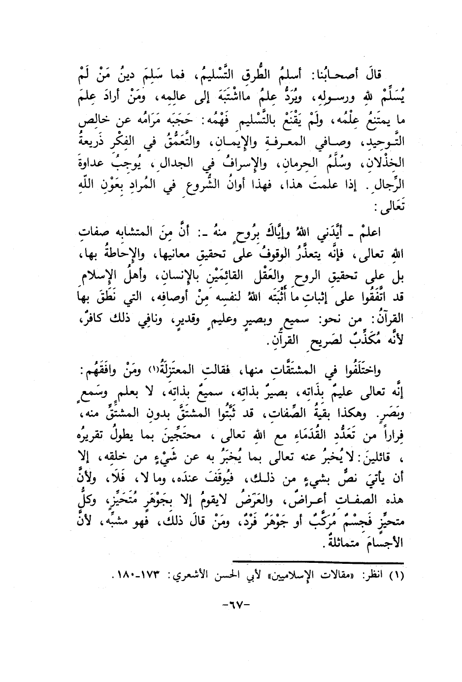 قَالَ أَصْحَابنَا أسلم الطّرق التَّسْلِيم فَمَا سلم دين من لم يسلم لله وَرَسُوله وَيرد علم مَا اشْتبهَ إِلَى عالمه وَمن أَرَادَ علم مَا يمْتَنع علمه وَلم يقنع بِالتَّسْلِيمِ فهمه حجبه مرامه عَن خَالص التَّوْحِيد وصافي الْمعرفَة وَالْإِيمَان والتعمق فِي الْفِكر ذَرِيعَة الخذلان وَسلم الحرمان والإسراف فِي الْجِدَال يُوجب عَدَاوَة الرِّجَال إِذا علمت هَذَا فَهَذَا أَوَان الشُّرُوع فِي المُرَاد بعون الله تَعَالَى