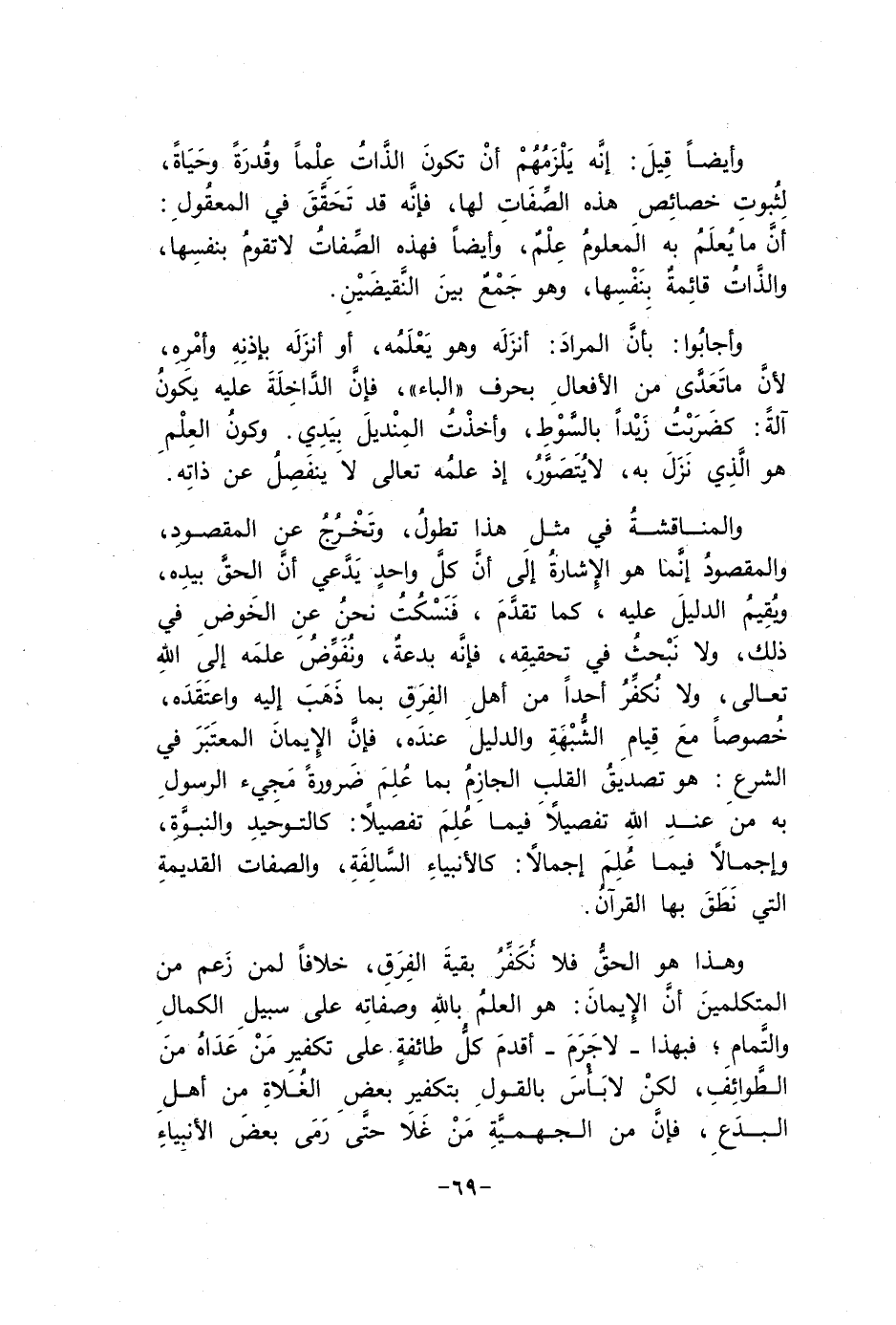 والمناقشة فِي مثل هَذَا تطول وَتخرج عَن الْمَقْصُود وَالْمَقْصُود إِنَّمَا هُوَ الْإِشَارَة إِلَى أَن كل وَاحِد يَدعِي أَن الْحق بِيَدِهِ وَيُقِيم الدَّلِيل عَلَيْهِ كَمَا تقدم فنسكت نَحن عَن الْخَوْض فِي ذَلِك وَلَا نبحث فِي تَحْقِيقه فَإِنَّهُ بِدعَة ونفوض علمه إِلَى الله تَعَالَى وَلَا نكفر أحدا من أهل الْفرق بِمَا ذهب إِلَيْهِ واعتقده خُصُوصا مَعَ قيام الشُّبْهَة وَالدَّلِيل عِنْده فَإِن الْإِيمَان الْمُعْتَبر فِي الشَّرْع هُوَ تَصْدِيق الْقلب الْجَازِم بِمَا علم ضَرُورَة مَجِيء الرَّسُول بِهِ من عِنْد الله تَفْصِيلًا فِيمَا علم تَفْصِيلًا كالتوحيد والنبوة وإجمالا فِيمَا علم إِجْمَالا كالأنبياء السالفة وَالصِّفَات الْقَدِيمَة الَّتِي نطق بهَا الْقُرْآن