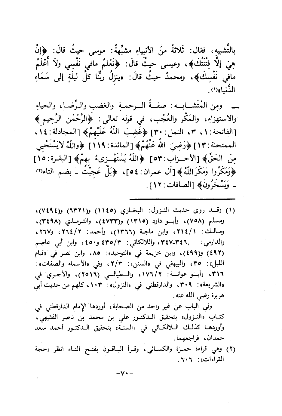 وَمن الْمُتَشَابه صفة الرَّحْمَة وَالْغَضَب وَالرِّضَا وَالْحيَاء والإستهزاء وَالْمَكْر وَالْعجب فِي قَوْله تَعَالَى {الرَّحْمَن الرَّحِيم} الْفَاتِحَة 1 3 النَّمْل 30 {غضب الله عَلَيْهِم} المجادلة 14 الممتحنة 13 {رَضِي الله عَنْهُم} الْمَائِدَة 119 {وَالله لَا يستحيي من الْحق} الْأَحْزَاب 53 {الله يستهزئ بهم} الْبَقَرَة 15 {ومكروا ومكر الله} آل عمرَان 54 {بل عجبت} بِضَم التَّاء {ويسخرون} الصافات 12