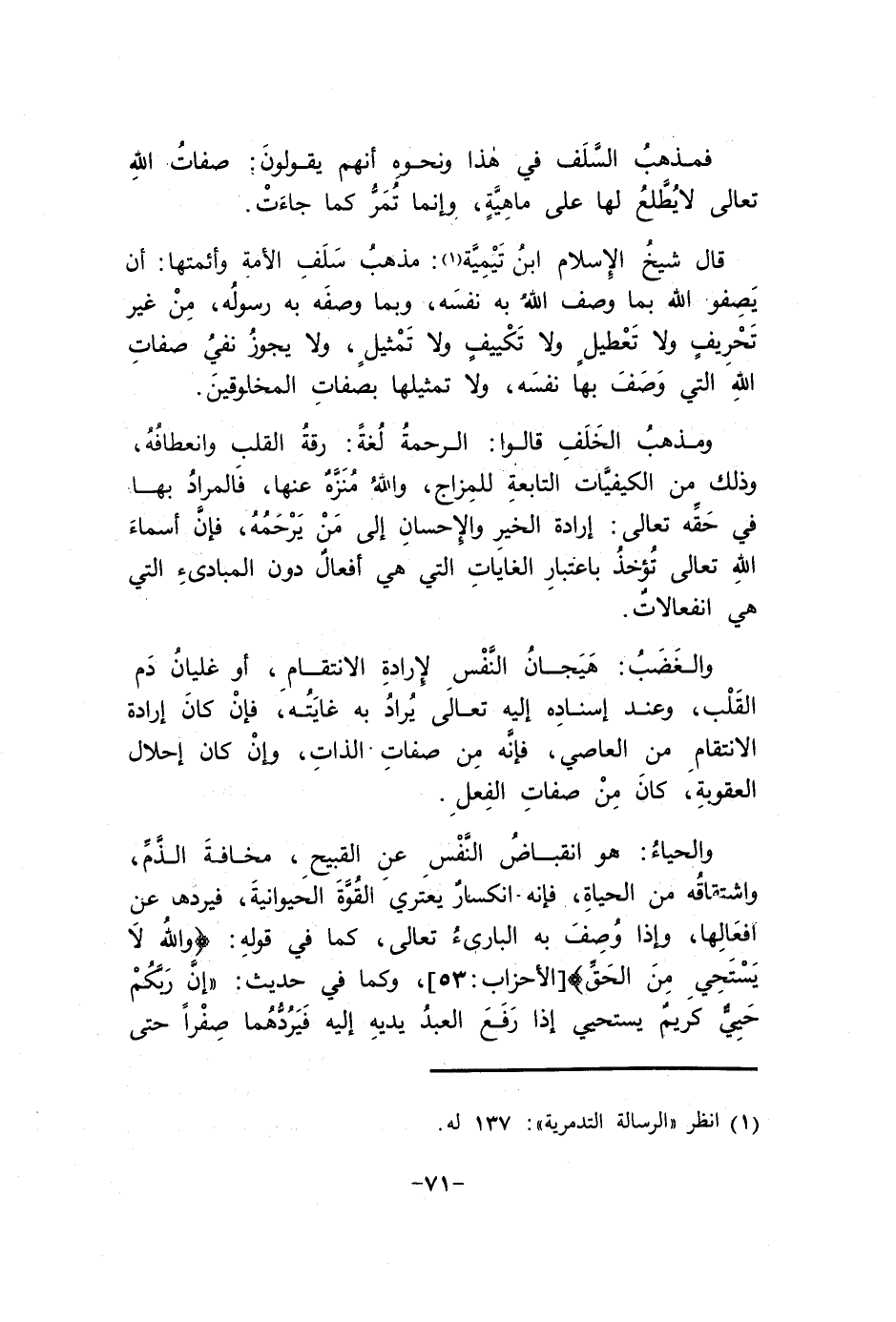 قَالَ شيخ الْإِسْلَام ابْن تَيْمِية مَذْهَب سلف الْأمة وأئمتها أَن يصفو الله بِمَا وصف الله بِهِ نَفسه وَبِمَا وَصفه بِهِ رَسُوله من غير تَحْرِيف وَلَا تَعْطِيل وَلَا تكييف وَلَا تَمْثِيل وَلَا يجوز نفي صِفَات الله الَّتِي وصف بهَا نَفسه وَلَا تمثيلها بِصِفَات المخلوقين