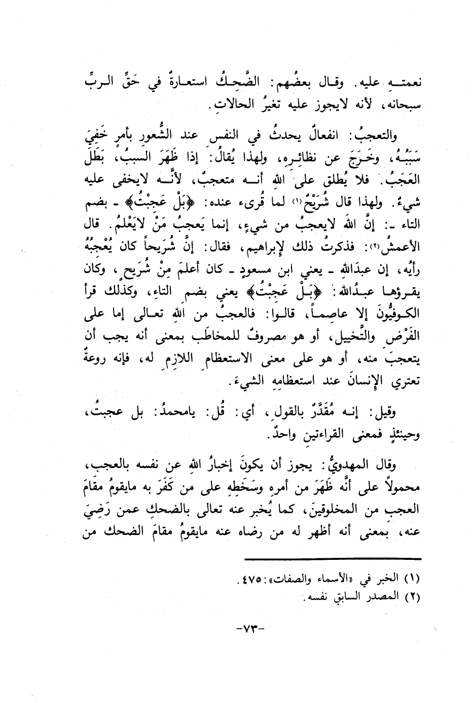والتعجب انفعال يحدث فِي النَّفس عِنْد الشُّعُور بِأَمْر خَفِي سَببه وَخرج عَن نَظَائِره وَلِهَذَا يُقَال إِذا ظهر السَّبَب بَطل الْعجب فَلَا يُطلق على الله أَنه متعجب لِأَنَّهُ لَا يخفى عَلَيْهِ شَيْء وَلِهَذَا قَالَ شُرَيْح لما قرئَ عِنْده {بل عجبت} بِضَم التَّاء إِن الله لَا يعجب من شَيْء إِنَّمَا يعجب من لَا يعلم قَالَ الْأَعْمَش فَذكرت ذَلِك لإِبْرَاهِيم فَقَالَ إِن شريحا كَانَ يُعجبهُ رَأْيه إِن عبد الله يَعْنِي ابْن مَسْعُود كَانَ أعلم من شُرَيْح وَكَانَ يقْرؤهَا عبد الله {بل عجبت} يَعْنِي بِضَم التَّاء وَكَذَلِكَ قَرَأَ الْكُوفِيُّونَ إِلَّا عَاصِمًا قَالُوا فالعجب من الله تَعَالَى إِمَّا على الْفَرْض والتخييل أَو هُوَ مَصْرُوف للمخاطب بِمَعْنى أَنه يجب أَن يتعجب مِنْهُ أَو هُوَ على معنى الإستعظام اللَّازِم لَهُ فَإِنَّهُ روعة تعتري الْإِنْسَان عِنْد استعظامه الشَّيْء