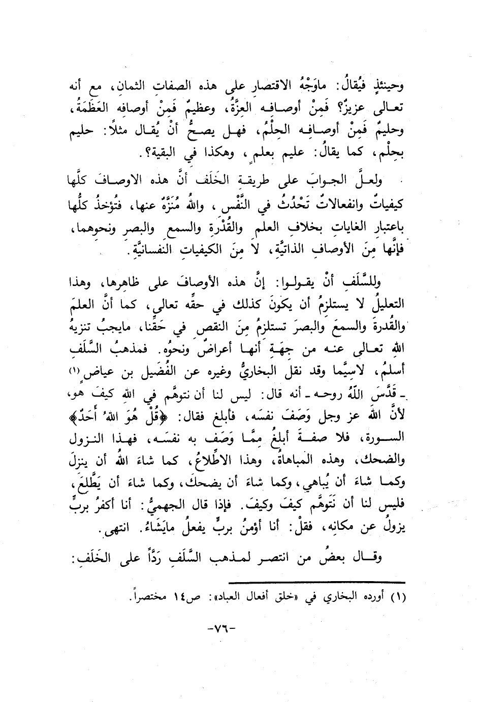 وللسلف أَن يَقُولُوا إِن هَذِه الْأَوْصَاف على ظَاهرهَا وَهَذَا التَّعْلِيل لَا يسْتَلْزم أَن يكون كَذَلِك فِي حَقه تَعَالَى كَمَا أَن الْعلم وَالْقُدْرَة والسمع وَالْبَصَر تَسْتَلْزِم من النَّقْص فِي حَقنا مَا يجب تَنْزِيه الله تَعَالَى عَنهُ من جِهَة أَنَّهَا أَعْرَاض وَنَحْوه فمذهب السّلف أسلم لَا سِيمَا وَقد نقل البُخَارِيّ وَغَيره عَن الفضيل بن عِيَاض قدس الله روحه أَنه قَالَ لَيْسَ لنا أَن نتوهم فِي الله كَيفَ هُوَ لِأَن الله عز وَجل وصف نَفسه فأبلغ فَقَالَ {قل هُوَ الله أحد} السُّورَة فَلَا صفة أبلغ مِمَّا وصف بِهِ نَفسه فَهَذَا النُّزُول والضحك وَهَذِه المباهاة وَهَذَا الإطلاع كَمَا شَاءَ الله أَن ينزل وكما شَاءَ أَن يباهي وكما شَاءَ أَن يضْحك وكما شَاءَ أَن يطلع فَلَيْسَ لنا أَن نتوهم كَيفَ وَكَيف فَإِذا قَالَ الجهمي أَنا أكفر بِرَبّ يَزُول عَن مَكَانَهُ فَقل أَنا أُؤْمِن بِرَبّ يفعل مَا يَشَاء أنْتَهى