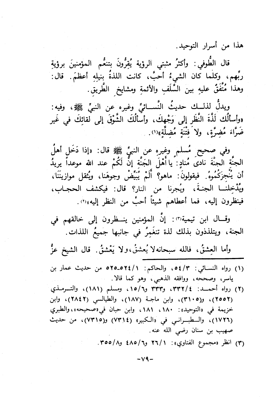 قَالَ الطوفي وَأكْثر مثبتي الرُّؤْيَة يقرونَ بتنعم الْمُؤمنِينَ بِرُؤْيَة رَبهم وَكلما كَانَ الشَّيْء أحب كَانَت اللَّذَّة بنيله أعظم قَالَ وَهَذَا مُتَّفق عَلَيْهِ بَين السّلف وَالْأَئِمَّة ومشايخ الطَّرِيق