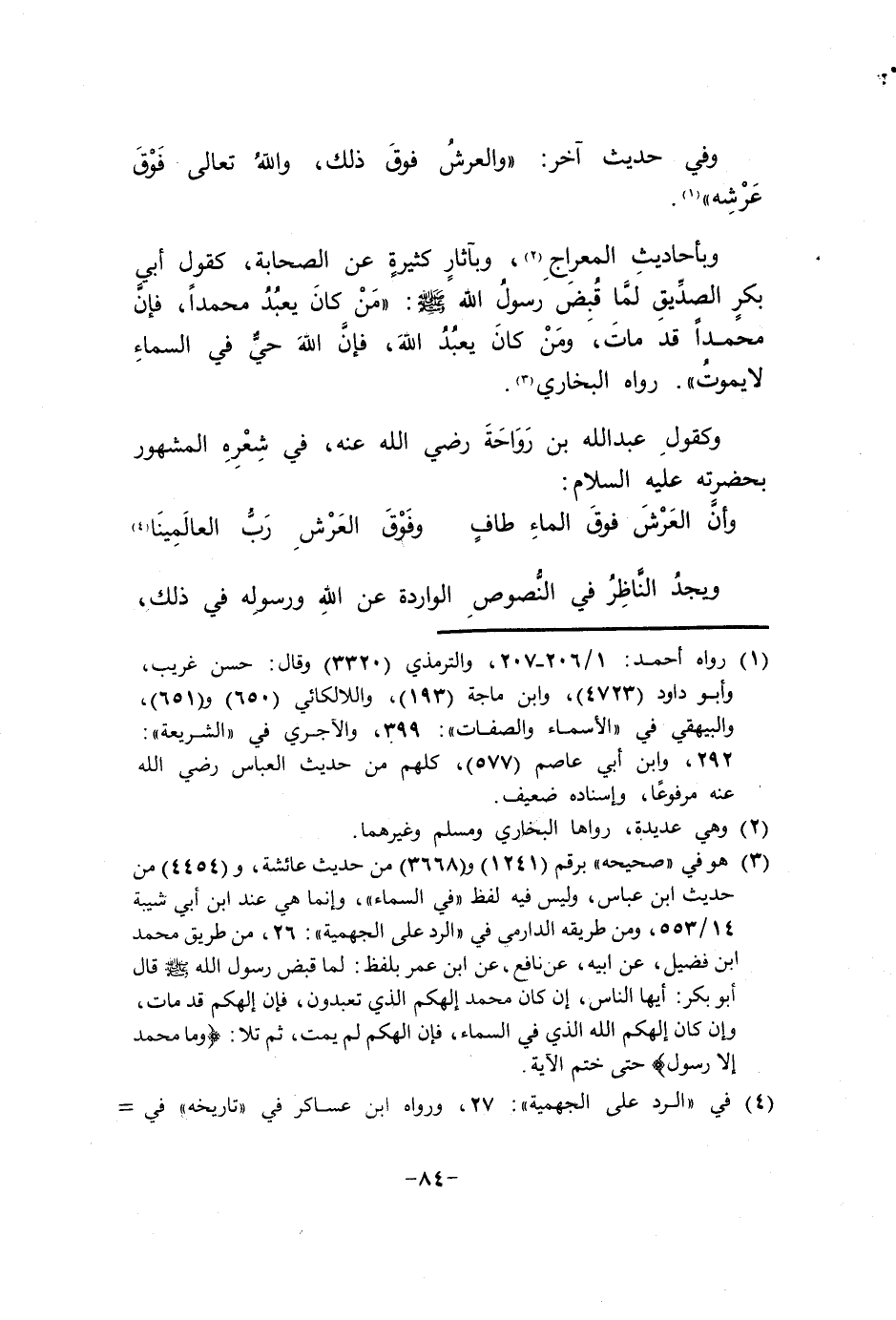 وكقول عبد الله بن رَوَاحَة رَضِي الله عَنهُ فِي شعره الْمَشْهُور بِحَضْرَتِهِ عَلَيْهِ السَّلَام ... وَأَن الْعَرْش فَوق المَاء طَاف ... وَفَوق الْعَرْش رب العالمينا ...