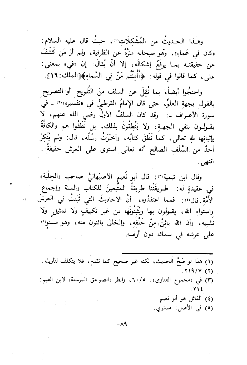 وَقَالَ ابْن تَيْمِية قَالَ أَبُو نعيم الْأَصْبَهَانِيّ صَاحب الْحِلْية فِي عقيدة لَهُ طريقتنا طَريقَة المتبعين للْكتاب وَالسّنة وَإِجْمَاع الْأمة قَالَ فمما اعتقدوه أَن الْأَحَادِيث الَّتِي ثبتَتْ فِي الْعَرْش وإستواء الله يَقُولُونَ بهَا ويثبتونها من غير تكييف وَلَا تَمْثِيل وَلَا تَشْبِيه وَأَن الله بَائِن من خلقه والخلق بائنون مِنْهُ وَهُوَ مستو على عَرْشه فِي سمائه دون أرضه