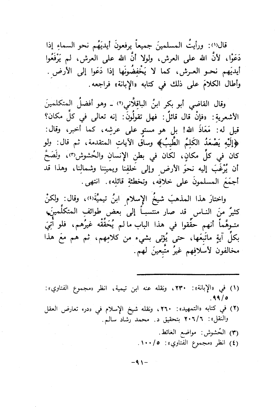 وأختار هَذِه الْمَذْهَب شيخ الْإِسْلَام ابْن تَيْمِية وَقَالَ وَلَكِن كثير من النَّاس قد صَار منتسبا إِلَى بعض طوائف الْمُتَكَلِّمين مُتَوَهمًا أَنهم حققوا فِي هَذَا الْبَاب مَا لم يحققه غَيرهم فَلَو أُتِي بِكُل آيَة مَا تبعها حَتَّى يُؤْتى بشىء من كَلَامهم ثمَّ هم مَعَ هَذَا مخالفون لأسلافهم غير متبعين لَهُم