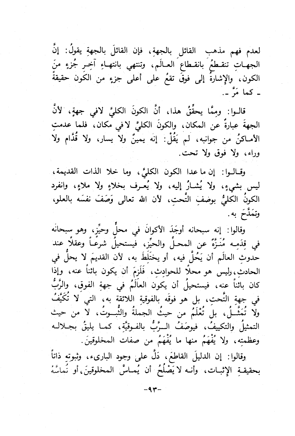 وَقَالُوا إِنَّه سُبْحَانَهُ أوجد الأكوان فِي مَحل وحيز وَهُوَ سُبْحَانَهُ فِي قدمه منزه عَن الْمحل والحيز فيستحيل شرعا وعقلا عِنْد حُدُوث الْعَالم أَن يحل فِيهِ أَو يخْتَلط بِهِ لِأَن الْقَدِيم لَا يحل فِي الْحَادِث وَلَيْسَ هُوَ محلا للحوادث فَلَزِمَ أَن يكون بَائِنا عَنهُ وَإِذا كَانَ بَائِنا عَنهُ فيستحيل أَن يكون الْعَالم فِي جِهَة الفوق والرب فِي جِهَة التحت بل هُوَ فَوْقه بالفوقية اللائقة بِهِ الَّتِي لَا تكيف وَلَا تمثل بل تعلم من حَيْثُ الْجُمْلَة والثبوت لَا من حَيْثُ التَّمْثِيل والتكييف فيوصف الرب بالفوقية كَمَا يَلِيق بجلاله وعظمته وَلَا يفهم مِنْهَا مَا يفهم من صِفَات المخلوقين