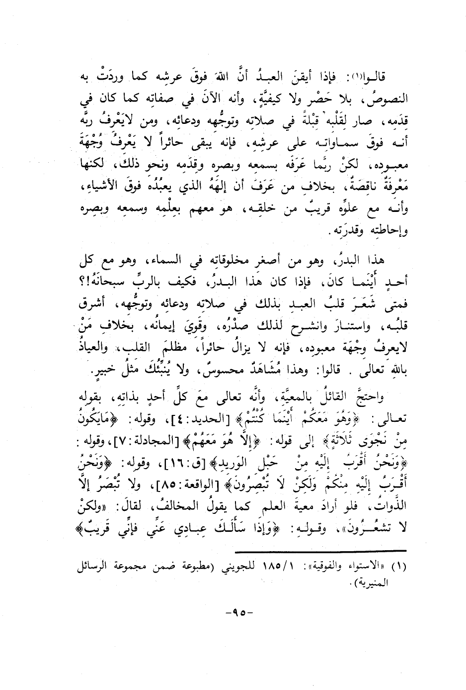 وَاحْتج الْقَائِل بالمعية وَأَنه تَعَالَى مَعَ كل أحد بِذَاتِهِ بقوله تَعَالَى {وَهُوَ مَعكُمْ أَيْن مَا كُنْتُم} الْحَدِيد 4 وَقَوله {مَا يكون من نجوى ثَلَاثَة} إِلَى قَوْله {إِلَّا هُوَ مَعَهم} المجادلة 7 وَقَوله {وَنحن أقرب إِلَيْهِ من حَبل الوريد} ق 16 وَقَوله {وَنحن أقرب إِلَيْهِ مِنْكُم وَلَكِن لَا تبصرون} الْوَاقِعَة 85 وَلَا تبصر إِلَّا الذوات فَلَو أَرَادَ معية الْعلم كَمَا يَقُول الْمُخَالف لقَالَ وَلَكِن لَا تشعرون وَقَوله {وَإِذا سَأَلَك عبَادي عني فَإِنِّي قريب}