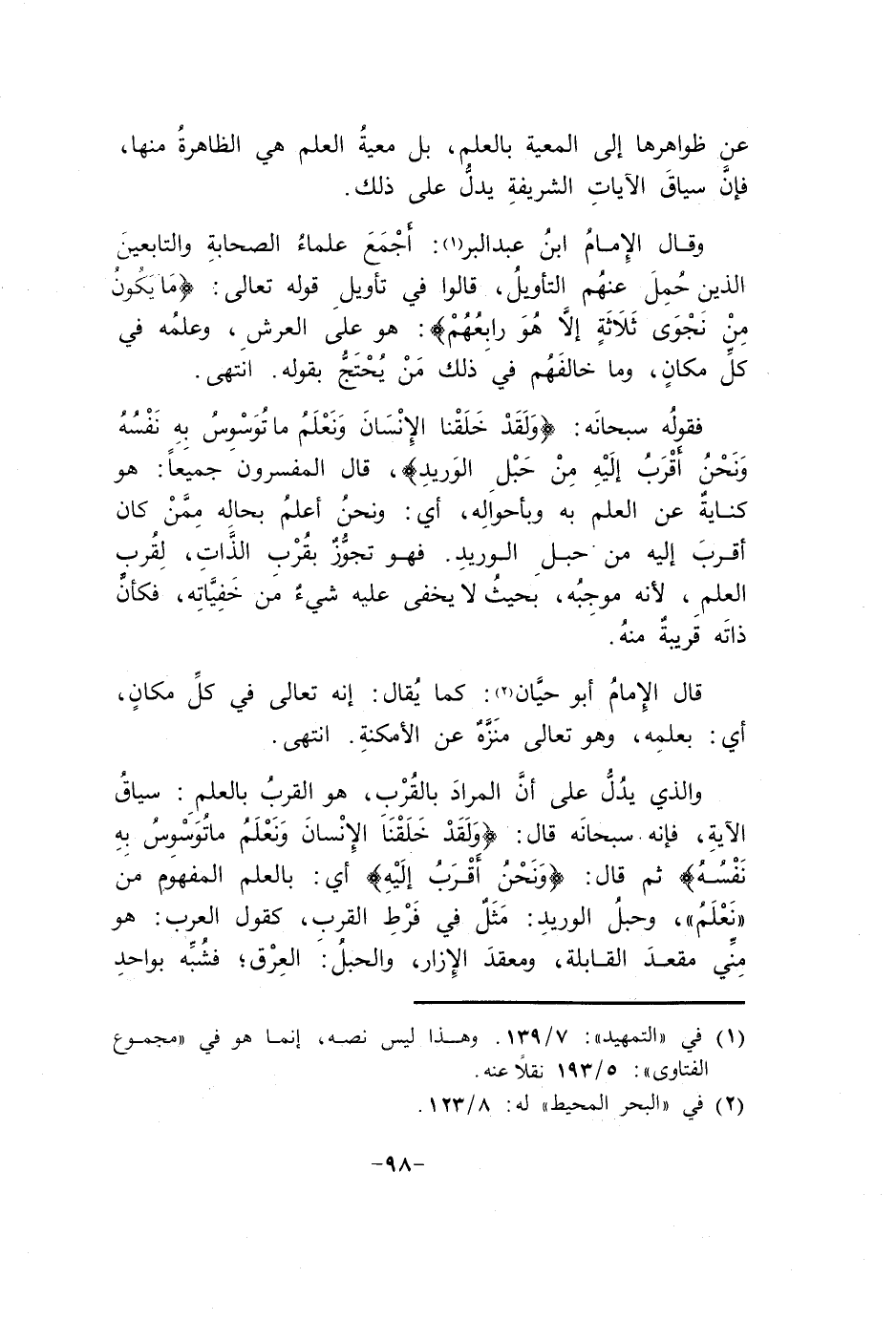فَقَوله سُبْحَانَهُ {وَلَقَد خلقنَا الْإِنْسَان ونعلم مَا توسوس بِهِ نَفسه وَنحن أقرب إِلَيْهِ من حَبل الوريد} قَالَ الْمُفَسِّرُونَ جَمِيعًا هُوَ كِنَايَة عَن الْعلم بِهِ وبأحواله أَي وَنحن أعلم بِحَالهِ مِمَّن كَانَ أقرب إِلَيْهِ من حَبل الوريد فَهُوَ تجوز بِقرب الذَّات لقرب الْعلم لِأَنَّهُ مُوجبه بِحَيْثُ لَا يخفى عَلَيْهِ شَيْء من خفياته فَكَأَن ذَاته قريبَة مِنْهُ