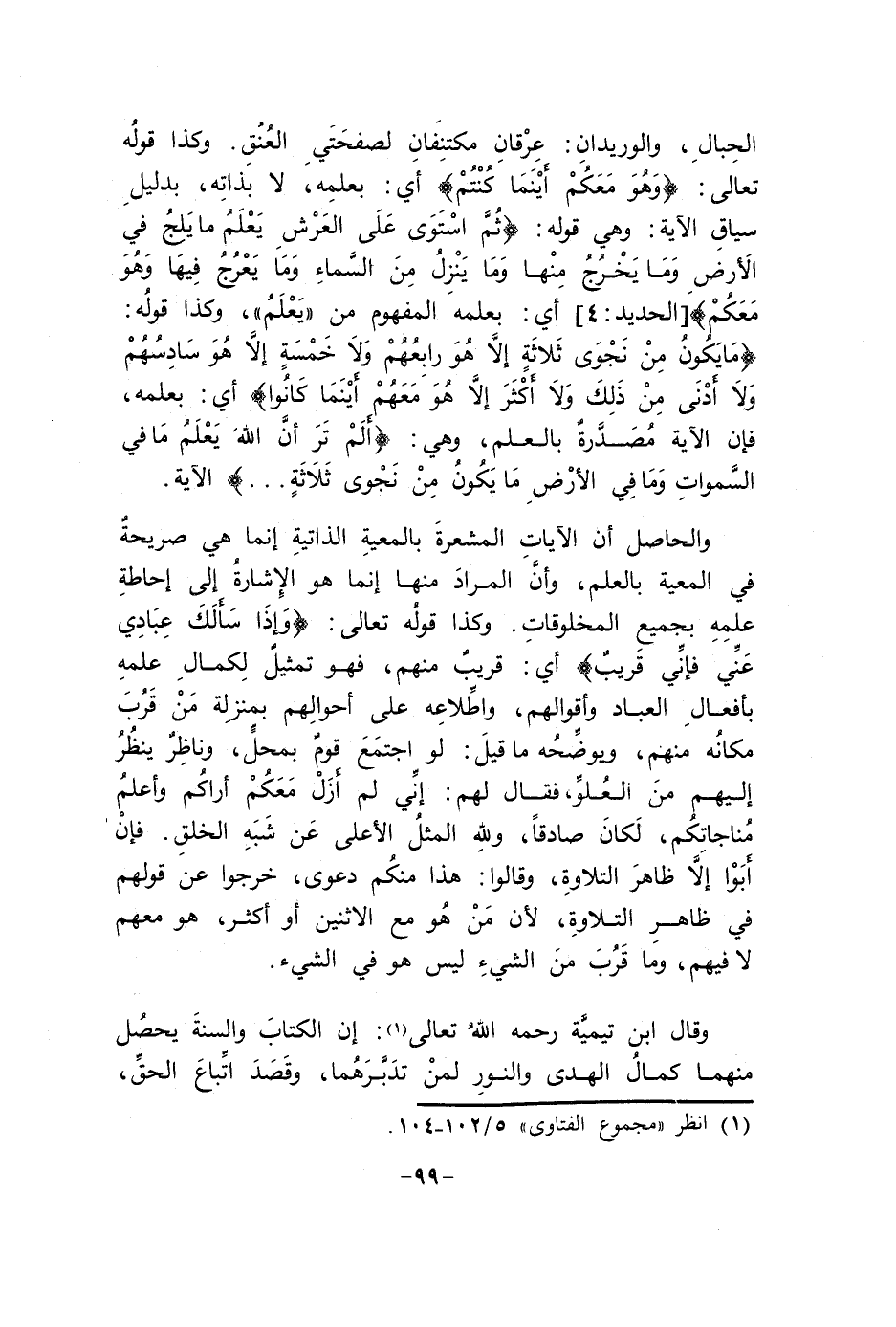 الحبال والوريدان عرقان مكتنفان لصفحتي الْعُنُق وَكَذَا قَوْله تَعَالَى {وَهُوَ مَعكُمْ أَيْن مَا كُنْتُم} أَي بِعِلْمِهِ لَا بِذَاتِهِ بِدَلِيل سِيَاق الْآيَة وَهِي قَوْله {ثمَّ اسْتَوَى على الْعَرْش يعلم مَا يلج فِي الأَرْض وَمَا يخرج مِنْهَا وَمَا ينزل من السَّمَاء وَمَا يعرج فِيهَا وَهُوَ مَعكُمْ} الْحَدِيد 4 أَي بِعِلْمِهِ الْمَفْهُوم من يعلم وَكَذَا قَوْله {مَا يكون من نجوى ثَلَاثَة إِلَّا هُوَ رابعهم وَلَا خَمْسَة إِلَّا هُوَ سادسهم وَلَا أدنى من ذَلِك وَلَا أَكثر إِلَّا هُوَ مَعَهم أَيْن مَا كَانُوا} أَي بِعِلْمِهِ فَإِن الْآيَة مصدرة بِالْعلمِ وَهِي {ألم تَرَ أَن الله يعلم مَا فِي السَّمَاوَات وَمَا فِي الأَرْض مَا يكون من نجوى ثَلَاثَة} الْآيَة