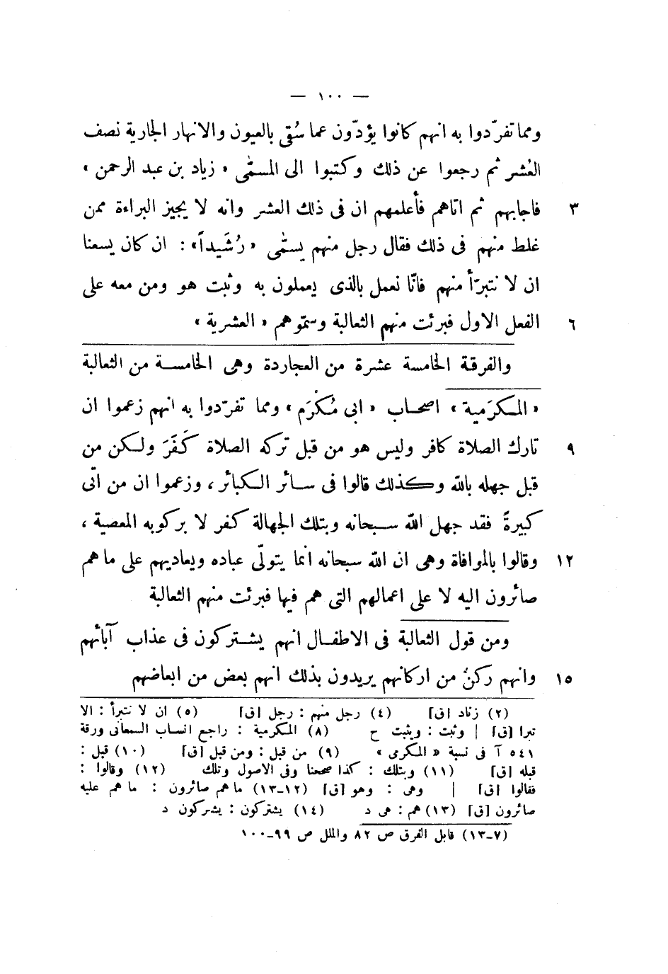 ومما تفردوا به أنهم كانوا يؤدون عما سقي بالعيون والأنهار الجارية نصف العشر ثم رجعوا عن ذلك وكتبوا إلى المسمى زياد بن عبد الرحمن فأجابهم ثم أتاهم فأعلمهم أن في ذلك العشر وأنه لا يجيز البراءة ممن غلط منهم في ذلك فقال رجل منهم يسمى رشيداً: إن كان يسعنا أن لا نتبرأ منهم فإنا نعمل بالذي يعملون به وثبت هو ومن معه على الفعل الأول فبرئت منهم الثعالبة وسموهم العشرية.