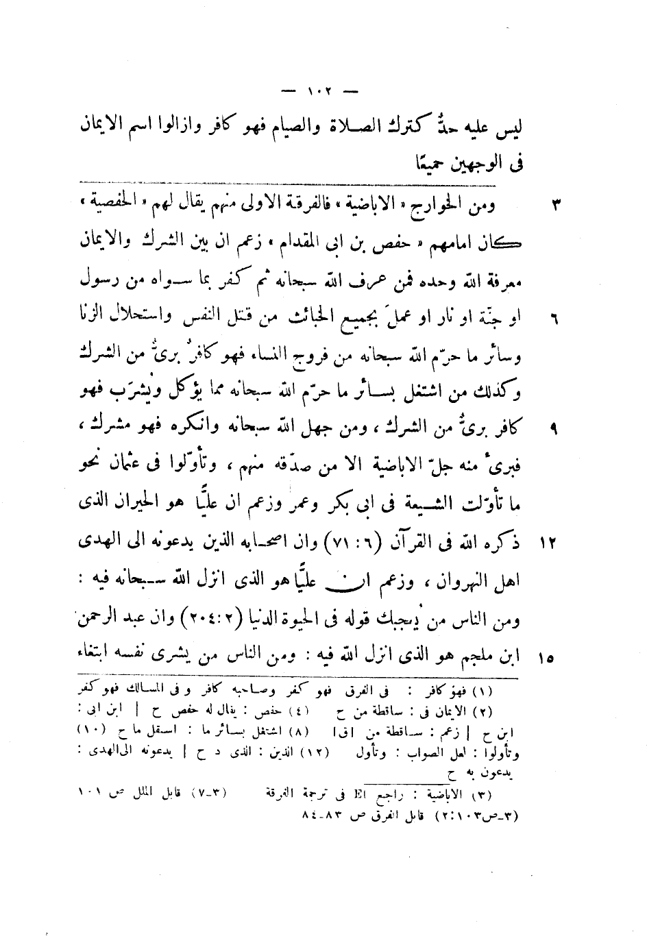ومن الخوارج الإباضية فالفرقة الأولى منهم يقال لهم الحفصية كان إمامهم حفص بن أبي المقدام زعم أن بين الشرك والإيمان معرفة الله وحده فمن عرف الله سبحانه ثم كفر بما سواه من رسول أو جنة أو نار أو عمل بجميع الخبائث من قتل النفس واستحلال الزنا وسائر ما حرم الله سبحانه من فروج النساء فهو كافر بري من الشرك وكذلك من اشتغل بسائر ما حرم الله سبحانه مما يؤكل ويشرب فهو كافر بري من الشرك، ومن جهل الله سبحانه وأنكره فهو مشرك، فبرئ منه جل الإباضية إلا من صدقه منهم، وتأولوا في عثمان نحو ما تأولت الشيعة في أبي بكر وعمر وزعم أن علياً هو الحيران الذي ذكره الله في القرآن وأن أصحابه