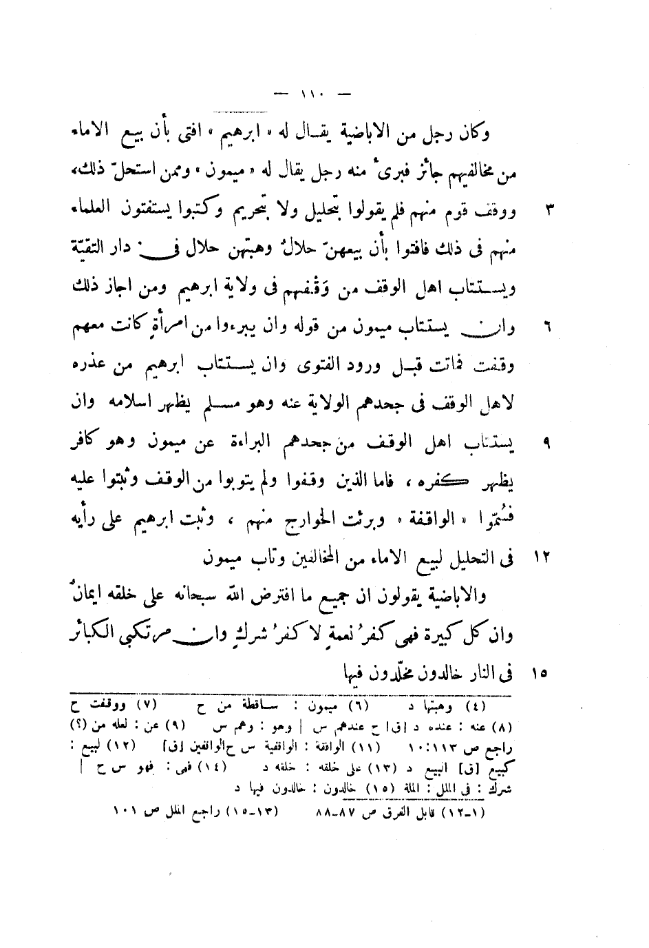 وكان رجل من الإباضية يقال له إبراهيم أفتى بأن بيع الإماء من مخالفيهم جائز فبرئ منه رجل يقال له ميمون وممن استحل ذلك، ووقف قوم منهم فلم يقولوا بتحليل ولا بتحريم وكتبوا يستفتون العلماء منهم في ذلك فأفتوا بأن بيعهن حلال وهبتهن حلال في دار التقية ويستتاب أهل الوقف من وقفهم في ولاية إبراهيم ومن أجاز ذلك وأن يستتاب ميمون من قوله وأن يبرءوا من امرأة كانت معهم وقفت فماتت قبل ورود الفتوى وأن يستتاب إبراهيم من عذره لأهل الوقف في جحدهم الولاية عنه وهو مسلم يظهر إسلامه وأن يستتاب أهل الوقف من جحدهم البراءة عن ميمون وهو كافر يظهر كفره، فأما الذين وقفوا ولم يتوبوا من الوقف وثبتوا عليه فسموا الواقفة وبرئت الخوارج منهم، وثبت إبراهيم على رأيه في التحليل لبيع الإماء من المخالفين وتاب ميمون.