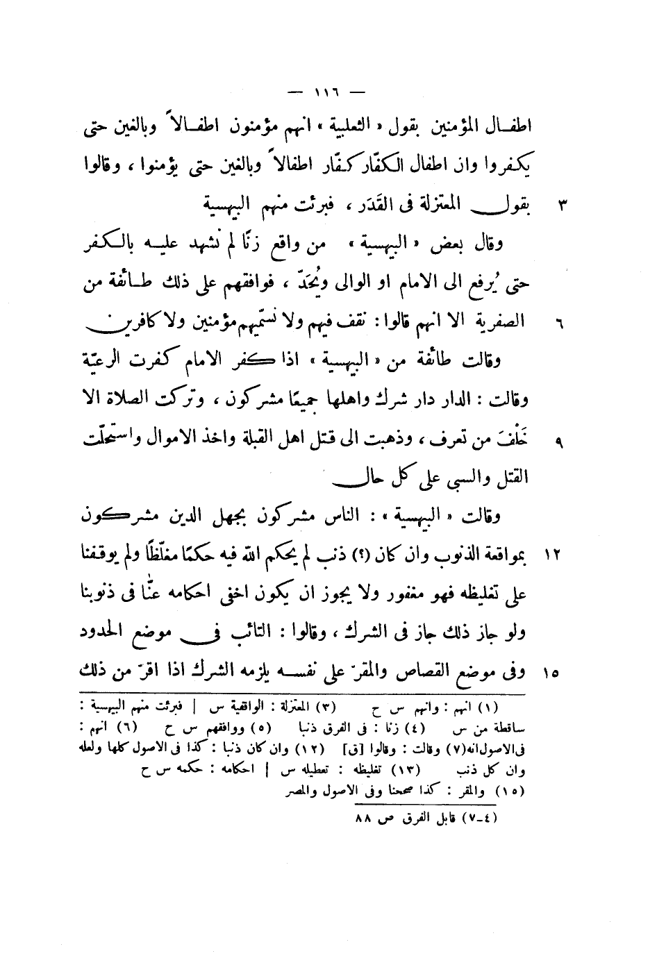 وقال بعض البيهسية من واقع زناً لم نشهد عليه بالكفر حتى يرفع إلى الإمام أو الوالي ويحد، فوافقهم على ذلك طائفة من الصفرية إلا أنهم قالوا: نقف فيهم ولا نسميهم مؤمنين ولا كافرين وقالت طائفة من البيهسية إذا كفر الإمام كفرت الرعية وقالت: الدار دار شرك وأهلها جميعاً مشركون، وتركت الصلاة إلا خلف من تعرف، وذهبت إلى قتل أهل القبلة وأخذ الأموال واستحلت القتل والسبي على كل حال.