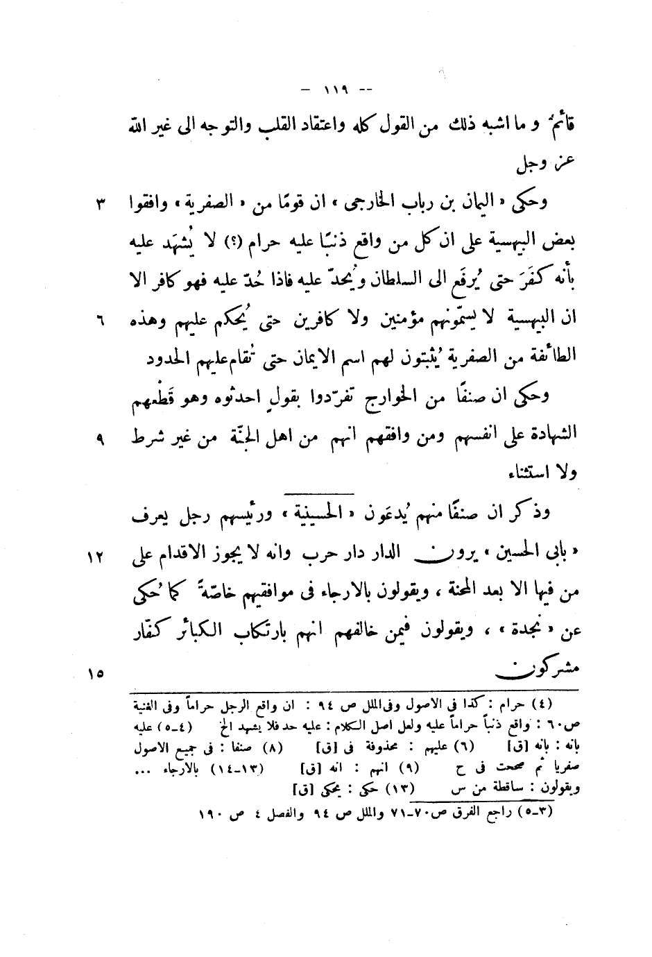 وذكر أن صنفاً منهم يدعون الحسينية ورئيسهم رجل يعرف بأبي الحسين يرون أن الدار دار حرب وأنه لا يجوز الإقدام على من فيها إلا بعد المحنة، ويقولون بالإرجاء في موافقيهم خاصة كما حكي عن نجدة، ويقولون فيمن خالفهم أنهم بارتكاب الكبائر كفار مشركون.