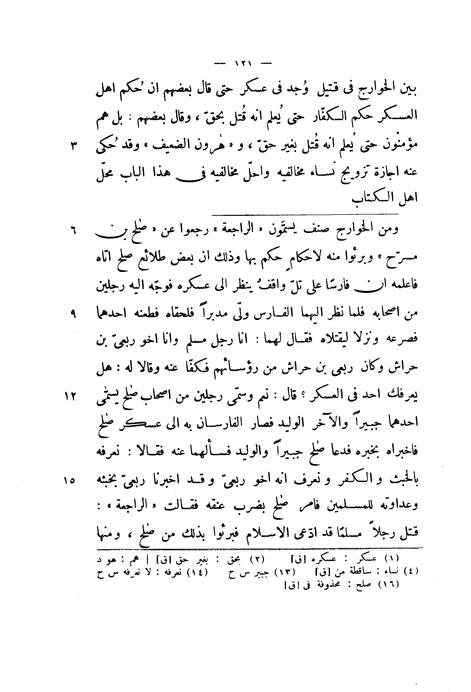 ومن الخوارج صنف يسمون الراجعة رجعوا عن صالح بن مسرح وبرئوا منه لأحكام حكم بها وذلك أن بعض طلائع صالح أتاه فأعلمه أن فارساً على تل واقف ينظر إلى عسكره فوجه إليه رجلين من أصحابه فلما نظر إليهما الفارس ولى مدبراً فلحقاه فطعنه أحدهما فصرعه ونزلا ليقتلاه فقال لهما: أنا رجل مسلم وأنا أخو ربعي بن حراش وكان ربعي بن حراش من رؤسائهم فكفا عنه وقالا له: هل يعرفك أحد في العسكر؟ قال: نعم وسمى رجلين من أصحاب صالح يسمى أحدهما جبيراً والآخر الوليد فصار الفرسان به إلى عسكر صالح فأخبراه بخبره فدعا صالح بن جبيراً والوليد فسألهما عنه فقالا: نعرفه بالخبث والكفر ونعرف أنه أخو ربعي وقد أخبرنا ربعي بخبثه وعداوته للمسلمين فأمر صالح بضرب عنقه فقالت الراجعة: قتل رجلاً مسلماً قد ادعى الإسلام فبرئوا بذلك من صالح، ومنها