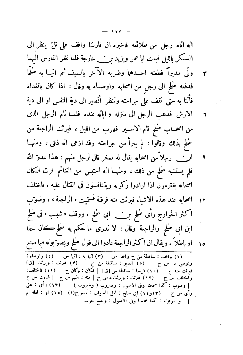 أبا عمر ويزيد بن خارجة فلما نظر الفارس إليهما ولى مدبراً فطعنه أحدهما وضربه الآخر بالسيف ثم أتيا به صالحاً فدفعه صالح إلى رجل من أصحابه وأوصاه به وقال: إذا كان بالغداة فأتنا به حتى نقف على جراحته وننظر أتصير إلى دية النفس أو إلى دية الأرش فذهب الرجل إلى منزله وأباته عنده فلما نام الرجل الذي من أصحاب صالح قام الأسير فهرب من الليل، فبرئت الراجعة من صالح بذلك وقالوا: لم يبرأ من جراحته وقد ادعى أنه ذمي، ومنها أن رجلاً من أصحابه يقال له صخر قال لرجل منهم: هذا عدو الله فلم يستتبه صالح من ذلك، ومنها أنه احتبس من الغنائم فرساً فكان أصحابه يقترعون إذا أرادوا ركوبه ويتنافسون في القتال عليه، فاختلف أصحابه عند هذه الأشياء فبرئت منه فرقة فسميت الراجعة، وصوب أكثر الخوارج رأي صالح بن أبي صالح، ووقف شبيب في صالح بن أبي صالح والراجعة وقال: لا ندري ما حكم به صالح كان حقاً أو باطلاً، ويقال أن أكثر الراجعة عادوا إلى قول صالح ويصوبونه فيما صنع.
