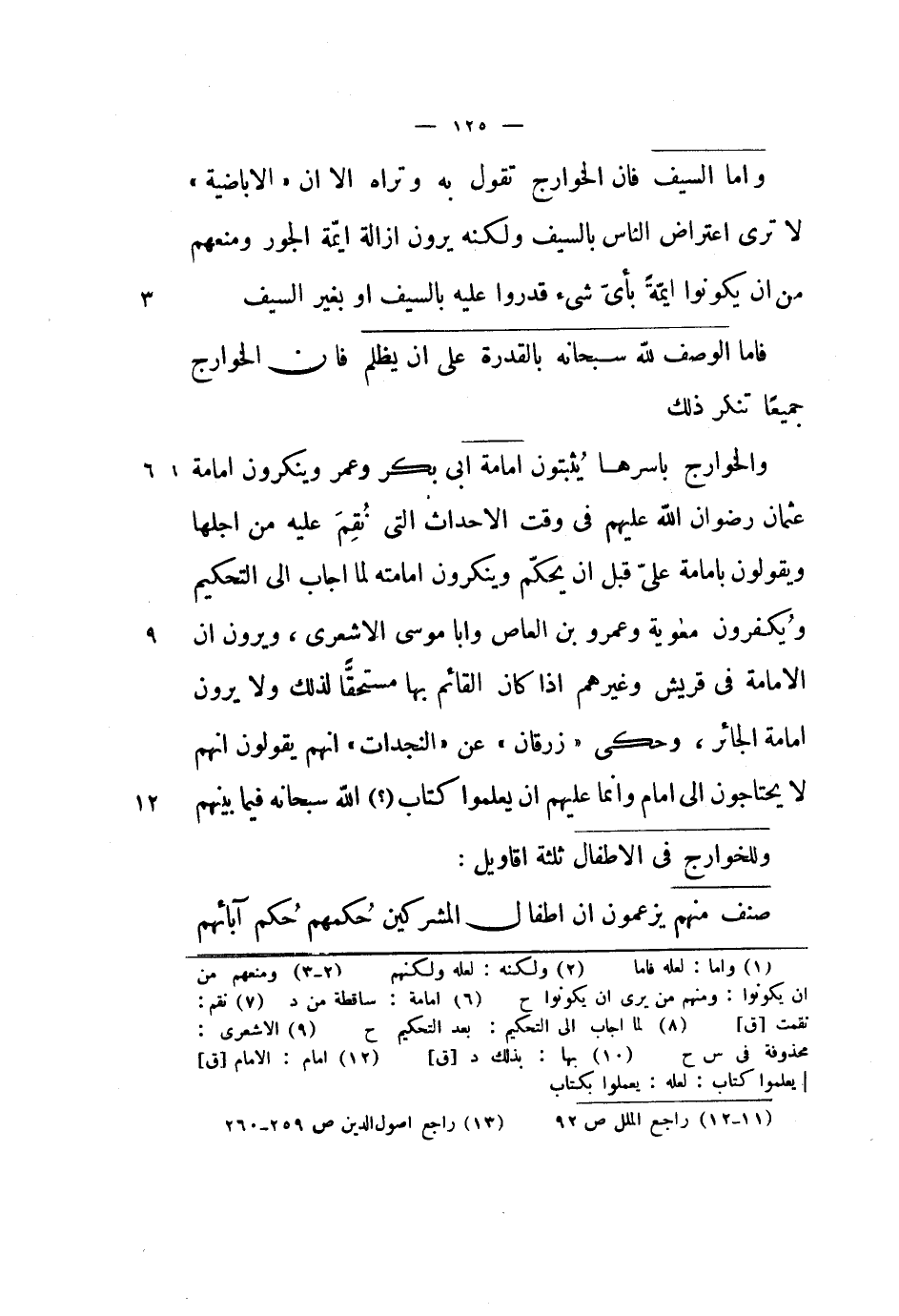 وأما السيف فإن الخوارج تقول به وتراه إلا أن الإباضيةلا ترى اعتراض الناس بالسيف ولكنه يرون إزالة أيمة الجور ومنعهم من أن يكونوا أيمة بأي شيء قدروا عليه بالسيف أو بغير السيف.