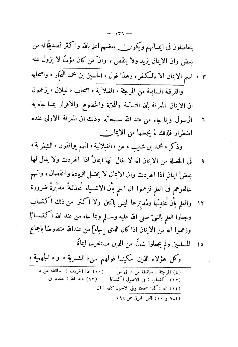 يتفاضلون في إيمانهم ويكون بعضهم أعلم بالله وأكثر تصديقاً له من بعض وأن الإيمان يزيد ولا ينقص، وأن من كان مؤمناً لا يزول عنه اسم الإيمان إلا بالكفر، وهذا قول الحسين بن محمد النجار وأصحابه.
