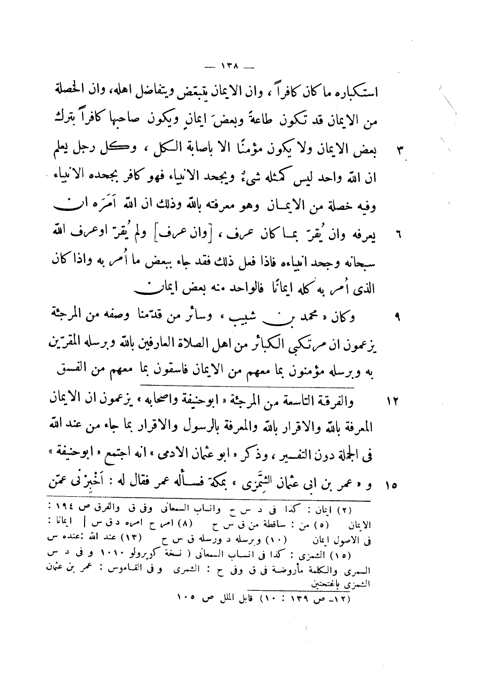 والفرقة التاسعة من المرجئة أبو حنيفة وأصحابه يزعمون أن الإيمان المعرفة بالله والإقرار بالله والمعرفة بالرسول والإقرار بما جاء من عند الله في الجملة دون التفسير، وذكر أبو عثمان الأدمي أنه اجتمع أبو حنيفة وعمر بن أبي عثمان