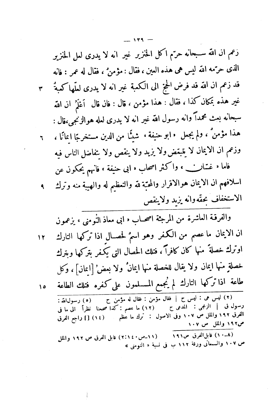 زعم أن الله سبحانه حرم أكل الخنزير غير أنه لا يدري لعل الخنزير الذي حرمه الله ليس هي هذه العين، فقال: مؤمن، فقال له عمر: فإنه قد زعم أن الله قد فرض الحج إلى الكعبة غير أنه لا يدري لعلها كعبة غير هذه بمكان كذا، فقال: هذا مؤمن، قال: فإن قال أعلم أن الله سبحانه بعث محمداً وأنه رسول الله غير أنه لا يدري لعله هو الزنجي، قال: هذا مؤمن، ولم يجعل أبو حنيفة شيئاً من الدين مستخرجاً إيماناً، وزعم أن الإيمان لا يتبعض ولا يزيد ولا ينقص ولا يتفاضل الناس فيه.