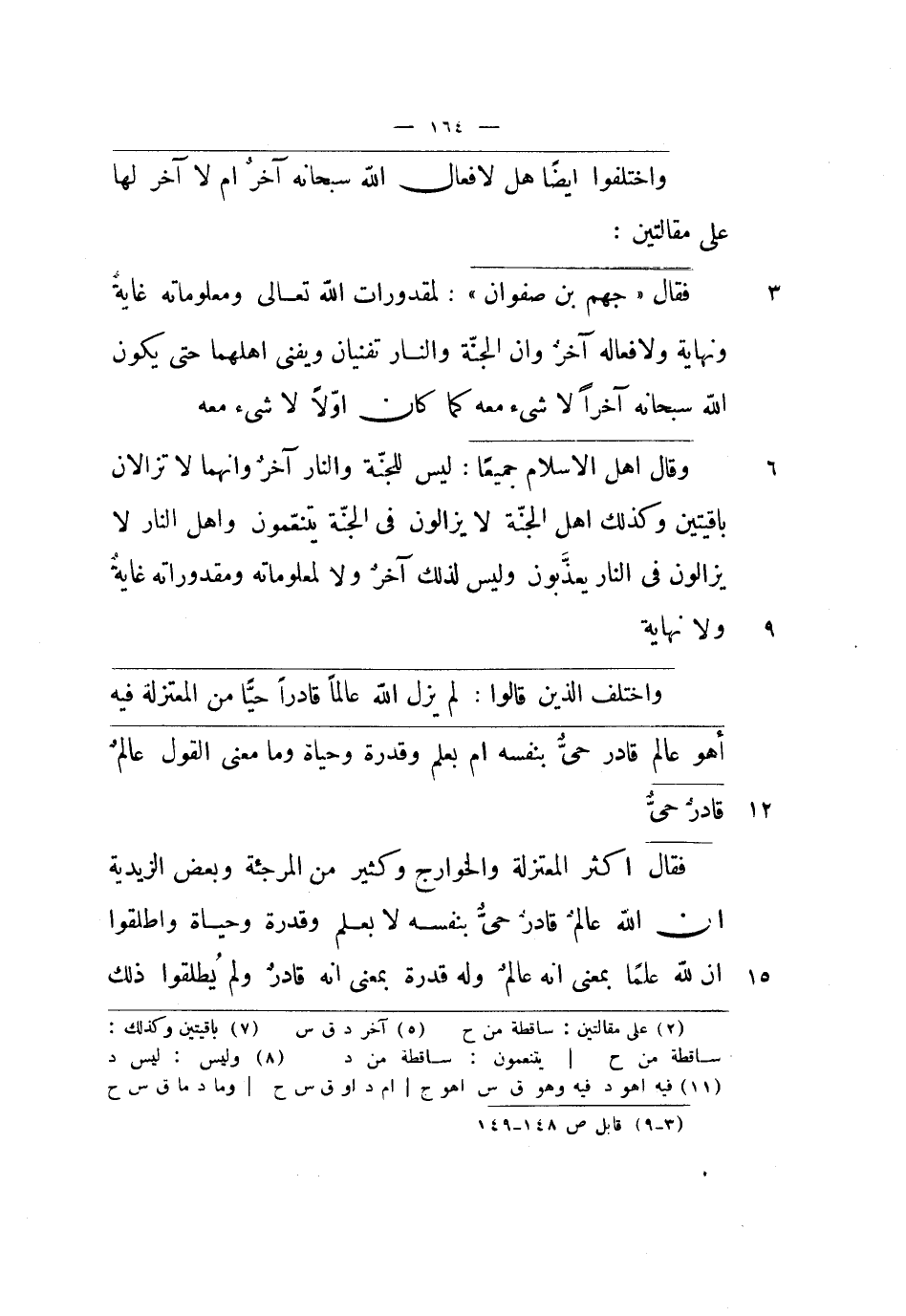 فقال جهم بن صفوان: لمقدورات الله تعالى ومعلوماته غاية ونهاية ولأفعاله آخر وأن الجنة والنار تفنيان ويفنى أهلهما حتى يكون الله سبحانه آخراً لا شيء معه كما كان أولاً لا شيء معه.