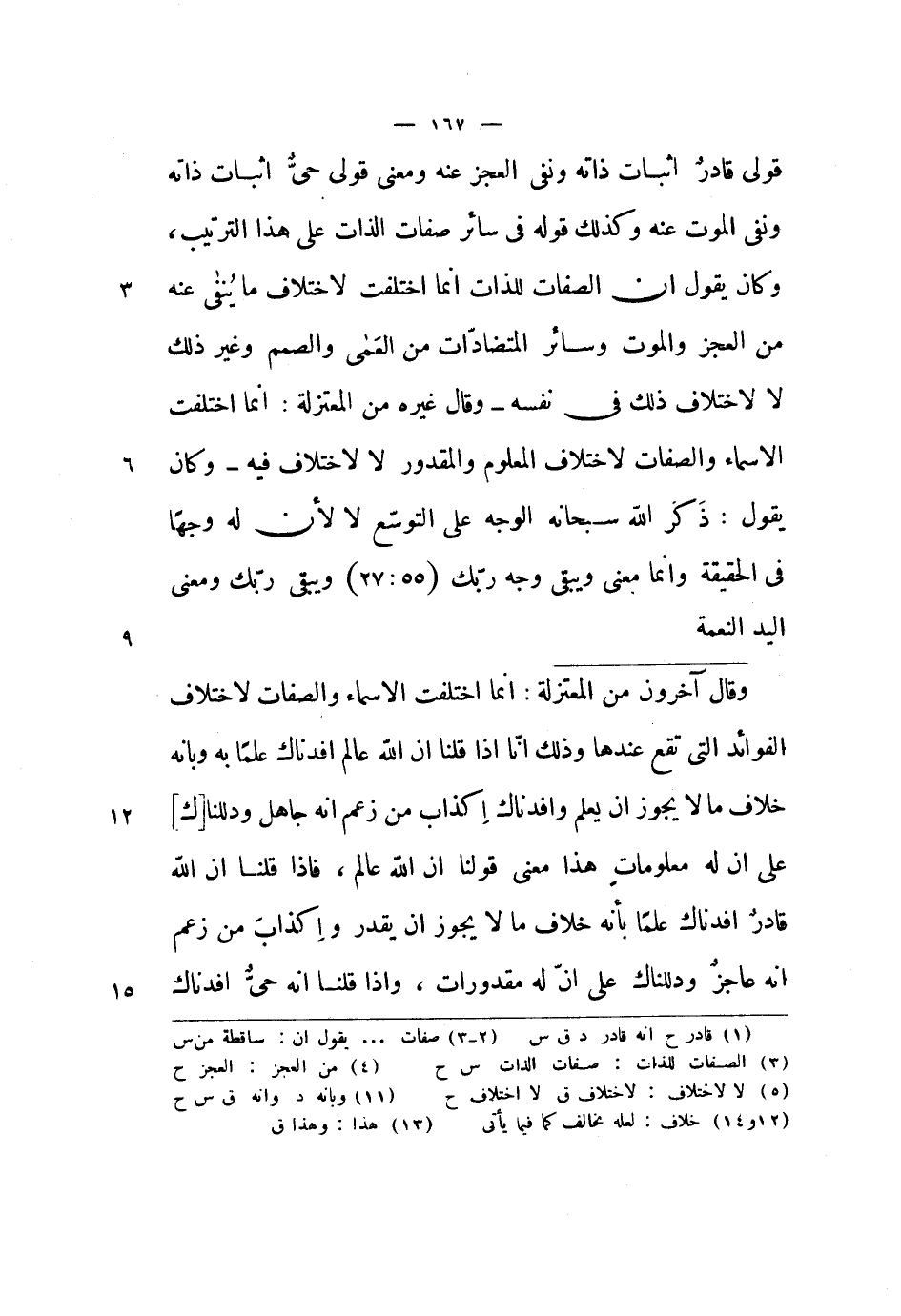 قولي قادر إثبات ذاته ونفي العجز عنه ومعنى قولي حي إثبات ذاته ونفي الموت عنه وكذلك قوله في سائر صفات الذات على هذا الترتيب، وكان يقول أن الصفات للذات إنما اختلفت لاختلاف ما ينفى عنه من العجز والموت وسائر المتضادات من العمى والصمم وغير ذلك لا لاختلاف ذلك في نفسه - وقال غيره من المعتزلة: إنما اختلفت الأسماء والصفات لاختلاف المعلوم والمقدور لا لاختلاف فيه - وكان يقول: ذكر الله سبحانه الوجه على التوسع لا لأنه له وجهاً في الحقيقة وإنما معنى ويبقى وجه ربك ويبقى ربك ومعنى اليد النعمة.