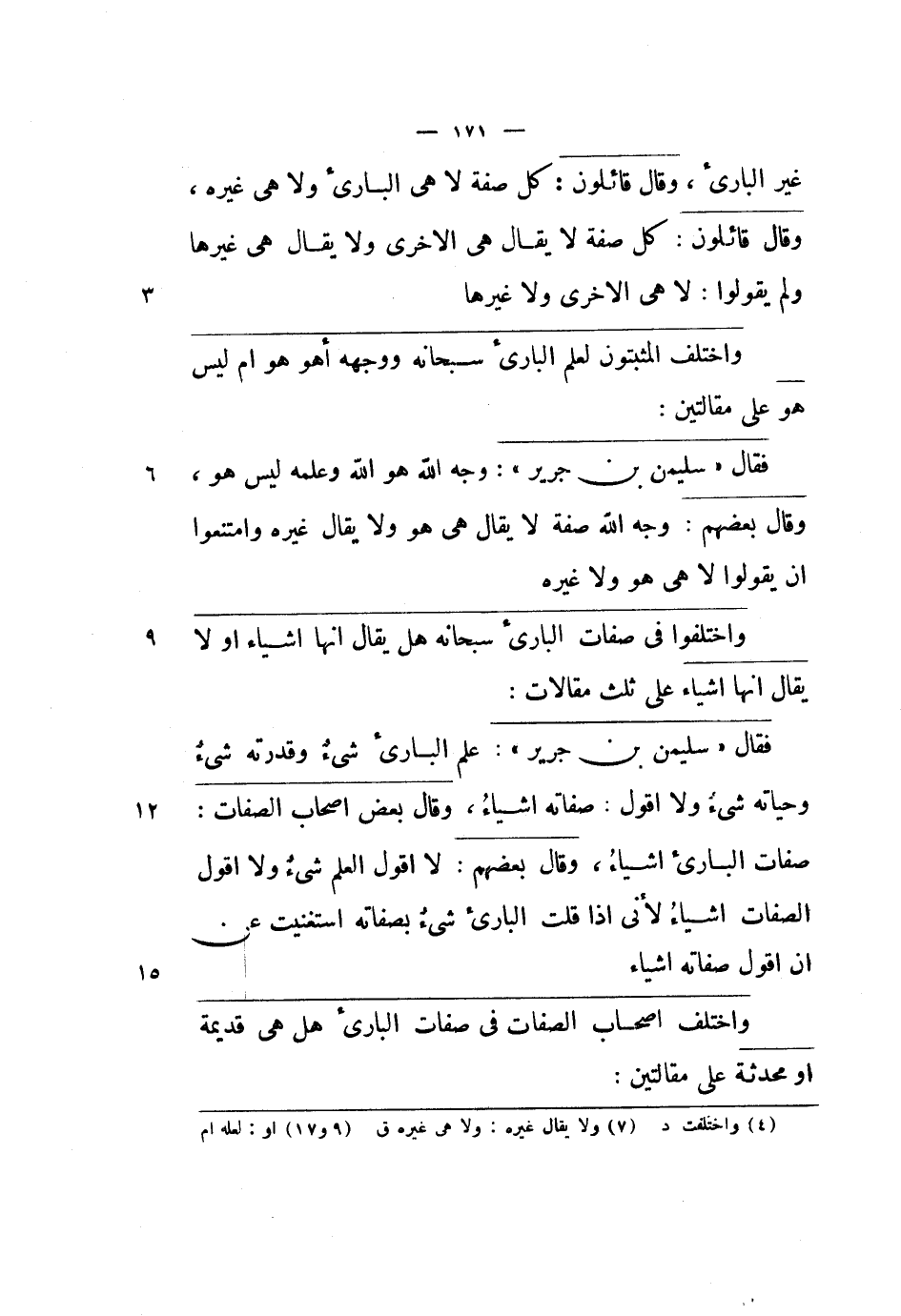 فقال سليمان بن جرير: علم البارئ شيء وقدرته شيء وحياته شيء ولا أقول: صفاته أشياء، وقال بعض أصحاب الصفات: صفات البارئ أشياء، وقال بعضهم: لا أقول العلم شيء ولا أقول الصفات أشياء لأني إذا قلت البارئ شيء بصفاته استغنيت عن أن أقول صفاته أشياء.