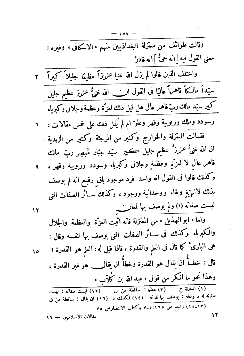 واختلف الذين قالوا لم يزل الله غنياً عزيزاً عظيماً جليلاً كبيراً سيداً مالكاً قاهراً عالياً في القول أن الله غني عزيز عظيم جليل كبير سيد مالك رب قاهر عال هل قيل ذلك لعزة وعظمة وجلال وكبرياء وسودد وملك وربوبية وقهر وعلو أم لم يقل ذلك على خمس مقالات: