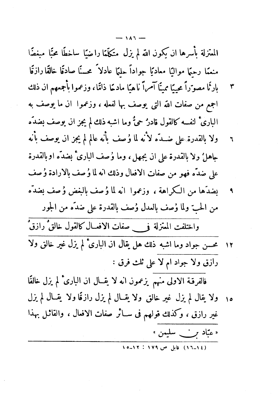 المعتزلة بأسرها أن يكون الله لم يزل متكلماً راضياً ساخطاً محباً مبغضاً منعماً رحيماً موالياً معادياً جواداً حليماً عادلاً محسناً صادقاً خالقاً رازقاً بارئاً مصوراً محيياً مميتاً آمراً ناهياً مادحاً ذاماً، وزعموا بأجمعهم أن ذلك أجمع من صفات الله التي يوصف بها لفعله، وزعموا أن