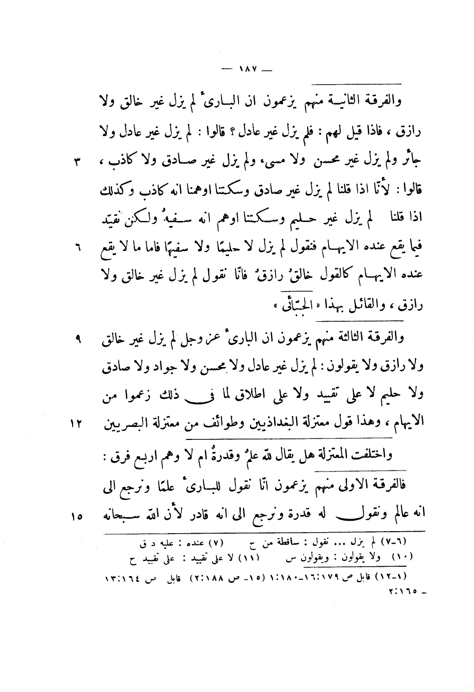 والفرقة الثالثة منهم يزعمون أن البارئ عز وجل لم يزل غير خالق ولا رازق ولا يقولون: لم يزل غير عادل ولا محسن ولا جواد ولا صادق ولا حليم لا على تقييد ولا على إطلاق لما في ذلك زعموا من الإيهام، وهذا قول معتزلة البغداذيين