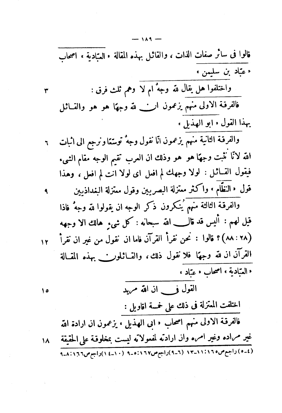 والفرقة الثالثة منهم ينكرون ذكر الوجه أن يقولوا لله وجه فإذا قيل لهم: أليس قد قال الله سبحانه: كل شيء هالك إلا وجهه قالوا: نحن نقرأ القرآن فأما أن نقول من غير أن نقرأ القرآن أن لله وجهاً فلا نقول ذلك، والقائلون بهذه المقالة العبادية أصحاب عباد.