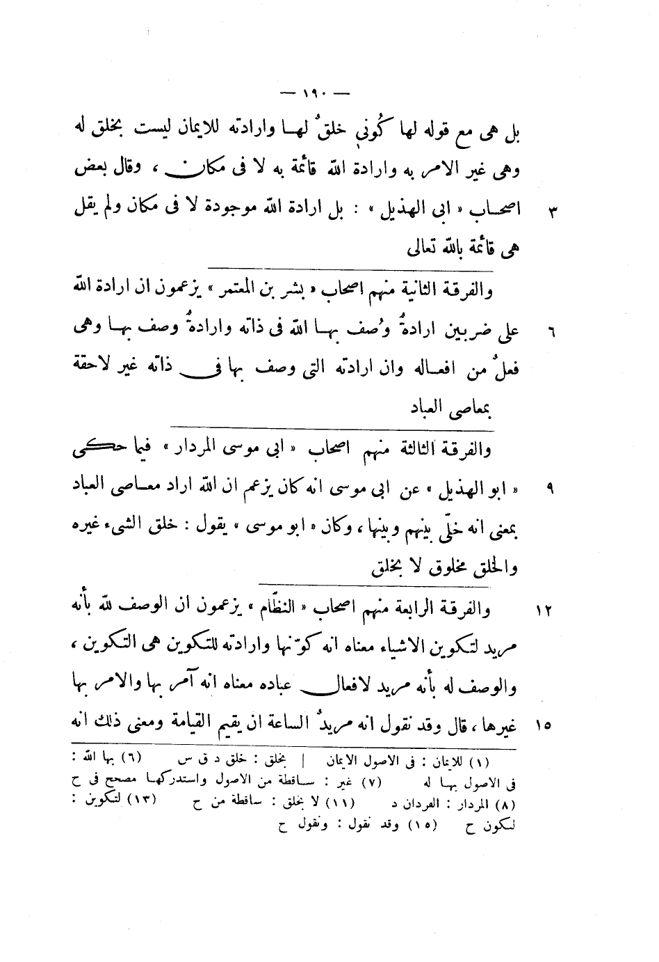 والفرقة الثالثة منهم أصحاب أبي موسى المردار فيما حكى أبو الهذيل عن أبي موسى أنه كان يزعم أن الله أراد معاصي العباد بمعنى أنه خلي بينهم وبينها، وكان أبو موسى يقول: خلق الشيء غيره والخلق مخلوق لا يخلق.