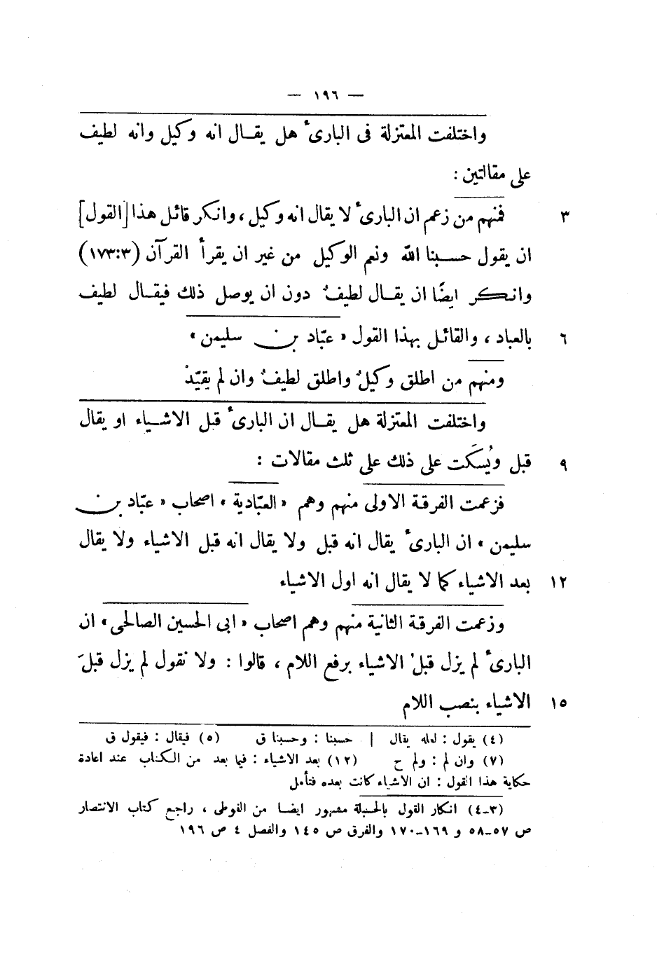 واختلفت المعتزلة في البارئ هل يقال أنه وكيل وأنه لطيف على مقالتين: