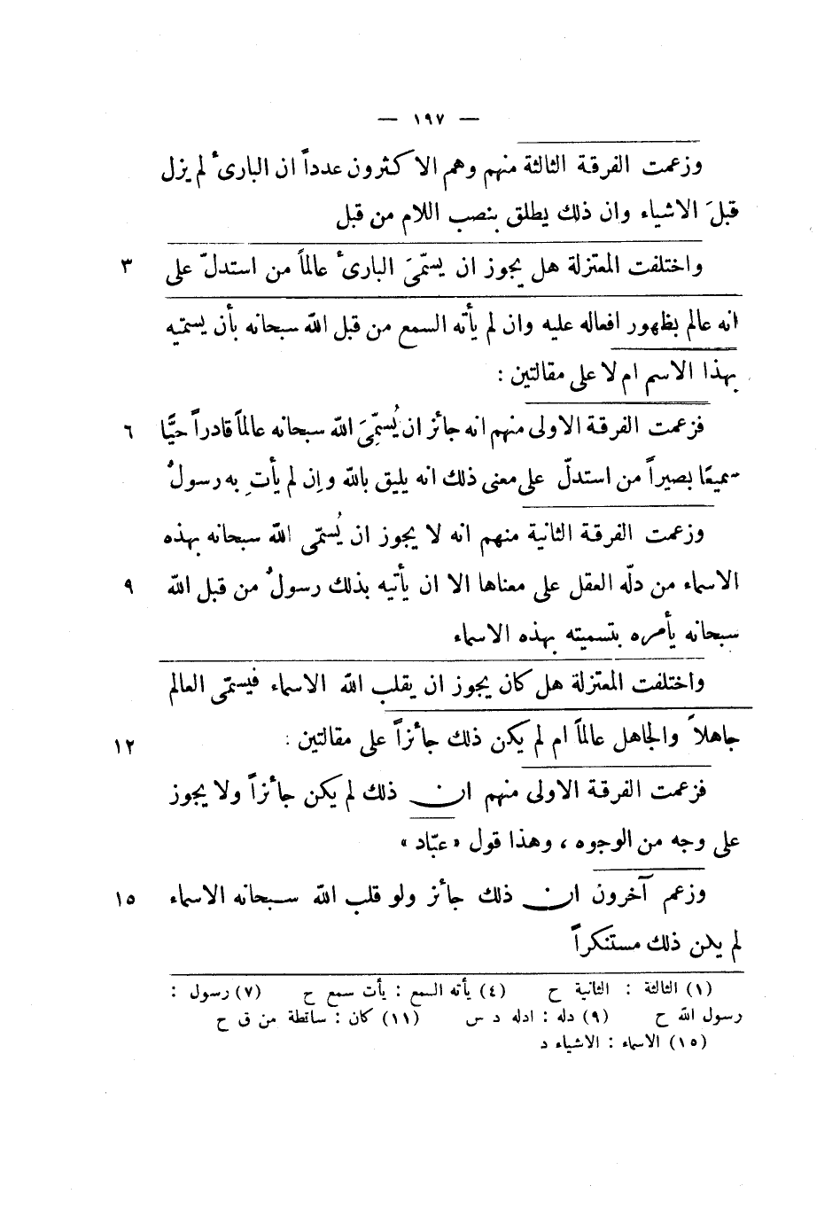 فزعمت الفرقة الأولى منهم أنه جائز أن يسمي الله سبحانه عالماً قادراً حياً سميعاً بصيراً من استدل على معنى ذلك أنه يليق بالله وإن لم يأت به رسول.