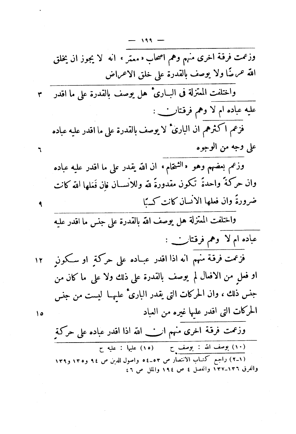 فزعمت فرقة منهم أنه إذا أقدر عباده على حركة أو سكون أو فعل من الأفعال لم يوصف بالقدرة على ذلك ولا على ما كان من جنس ذلك، وأن الحركات التي يقدر البارئ عليها ليست من جنس الحركات التي أقدر عليها غيره من العباد.