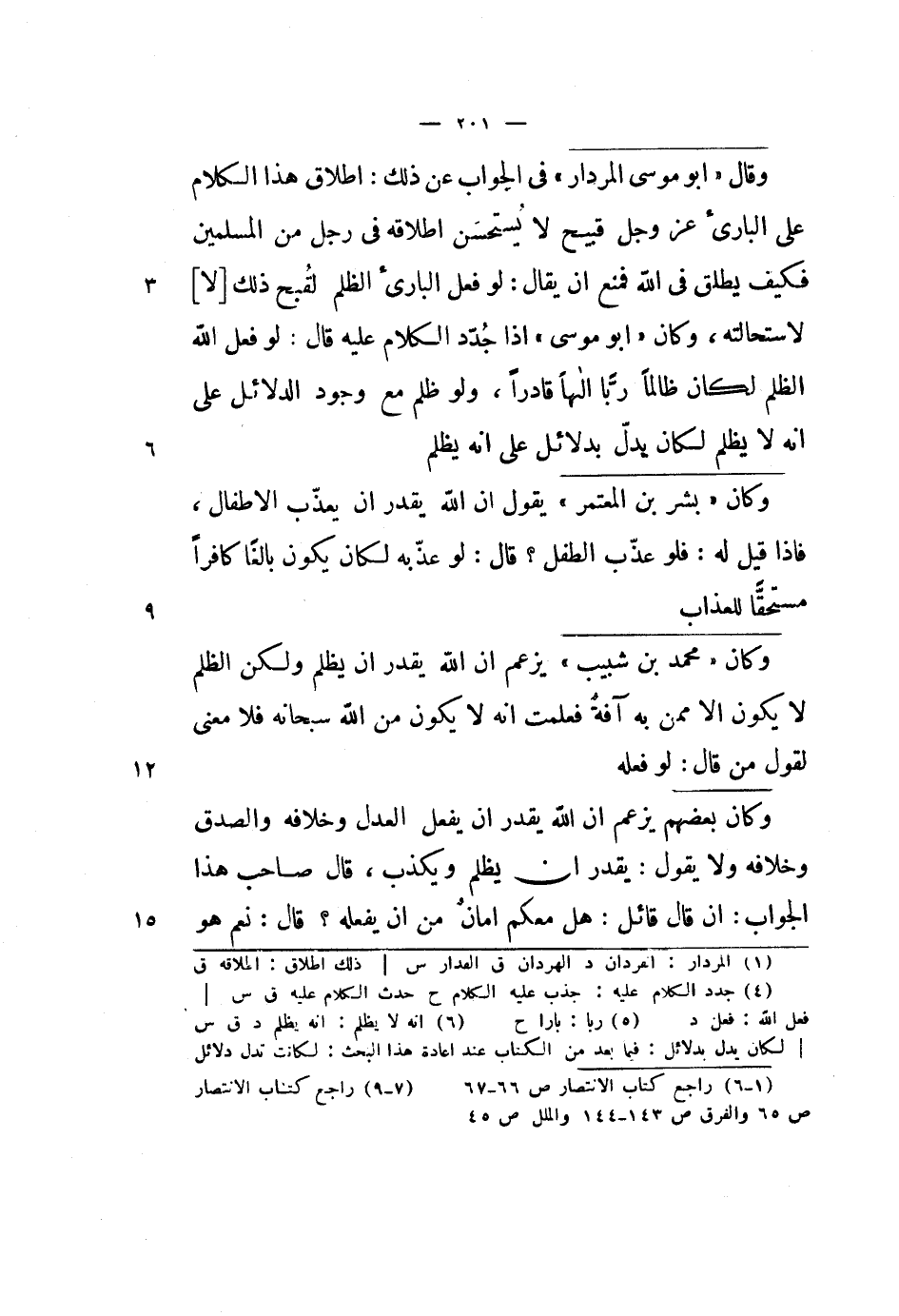 وقال أبو موسى المردار في الجواب عن ذلك: إطلاق هذا الكلام على البارئ عز وجل قبيح لا يستحسن إطلاقه في رجل من المسلمين فكيف يطلق في الله فمنع أن يقال: لو فعل البارئ الظلم لقبح ذلك لا لاستحالته، وكان أبو موسى إذا جدد الكلام عليه قال: لو فعل الله الظلم لكان ظالماً رباً إلهاً قادراً، ولو ظلم مع وجود الدلائل على أنه لا يظلم لكان يدل بدلائل على أنه يظلم.