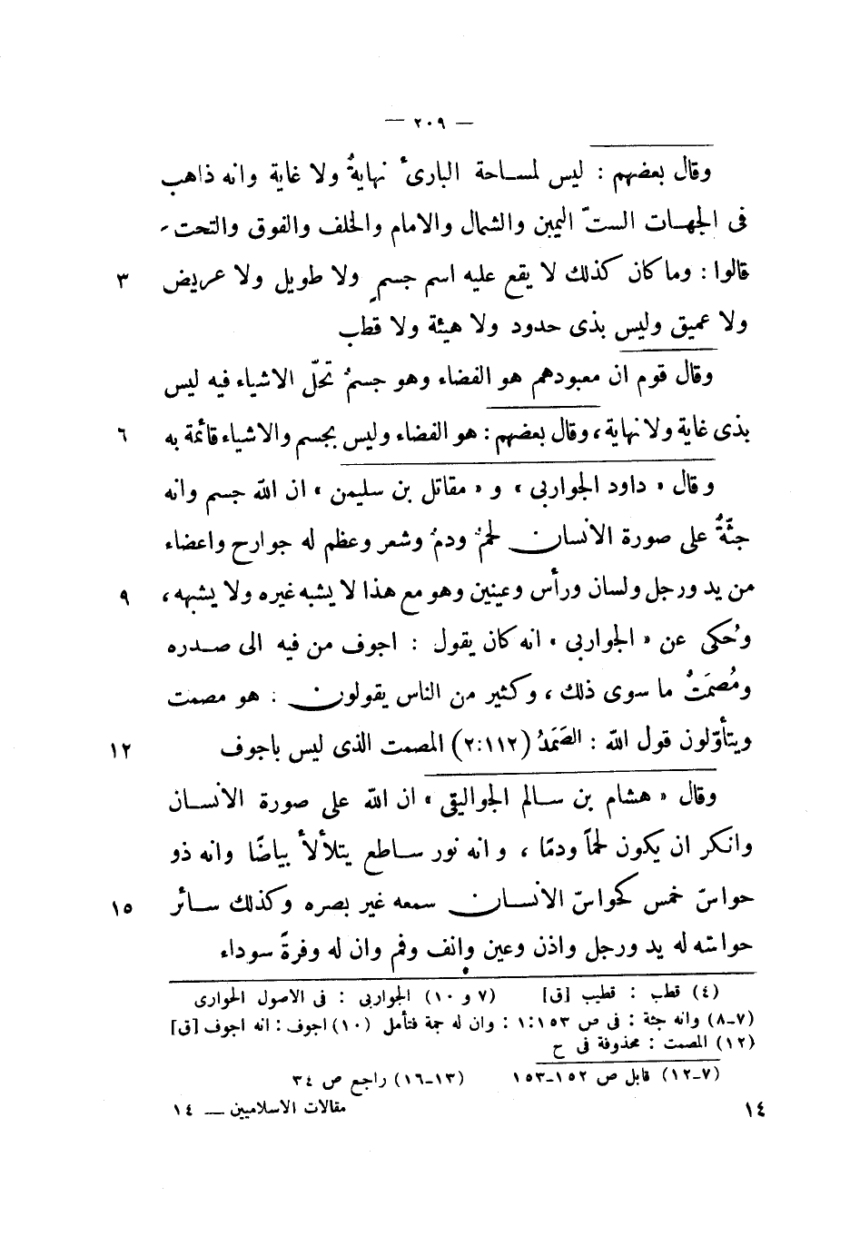 وقال داود الجواربي ومقاتل بن سليمان أن الله جسم وأنه جثة على صورة الإنسان لحم وذم وشعر وعظم له جوارح وأعضاء من يد ورجل ولسان ورأس وعينين وهو مع هذا لا يشبه غيره ولا يشبهه، وحكي عن الجواربي أنه كان يقول: أجوف من فيه إلى صدره ومصمت ما سوى ذلك، وكثير من الناس يقولون: هو مصمت ويتأولون قول الله: الصمد المصمت الذي ليس بأجوف.