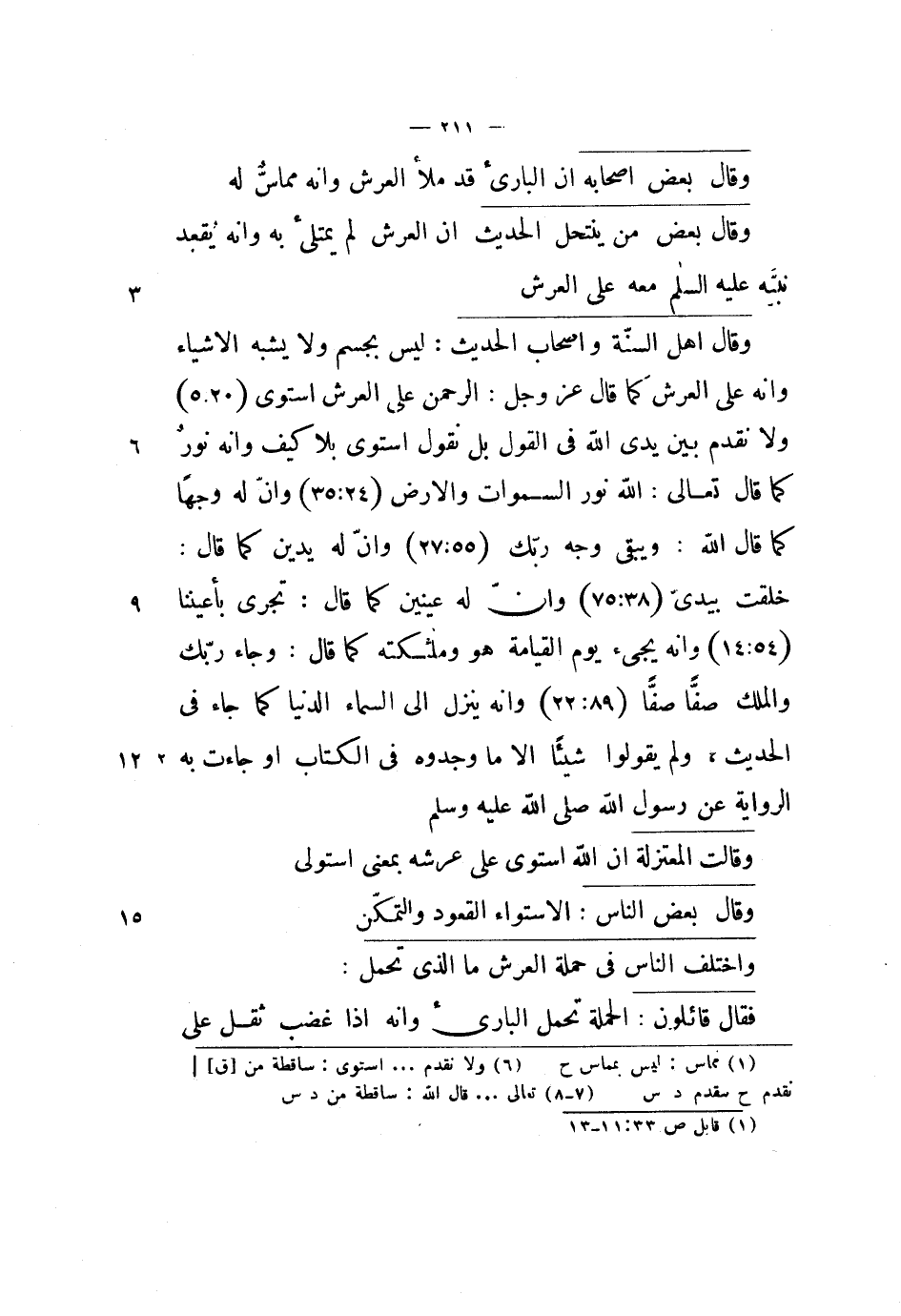 وقال أهل السنة وأصحاب الحديث: ليس بجسم ولا يشبه الأشياء وأنه على العرش كما قال عز وجل: الرحمن على العرش استوى ولا نقدم بين يدي الله في القول بل نقول استوى بلا كيف وأنه نور كما قال تعالى: الله نور السموات والأرض وأن له وجهاً كما قال الله: ويبقى وجه ربك وأن له يدين كما قال: خلقت بيدي وأن له عينين كما قال: تجري بأعيننا وأنه يجيء يوم القيامة هو وملائكته كما قال: وجاء ربك والملك صفاً صفاً وأنه ينزل إلى السماء الدنيا كما جاء في الحديث، ولم يقولوا شيئاً إلا ما وجدوه في الكتاب أو جاءت به الرواية عن رسول الله صلى الله عليه وسلم.