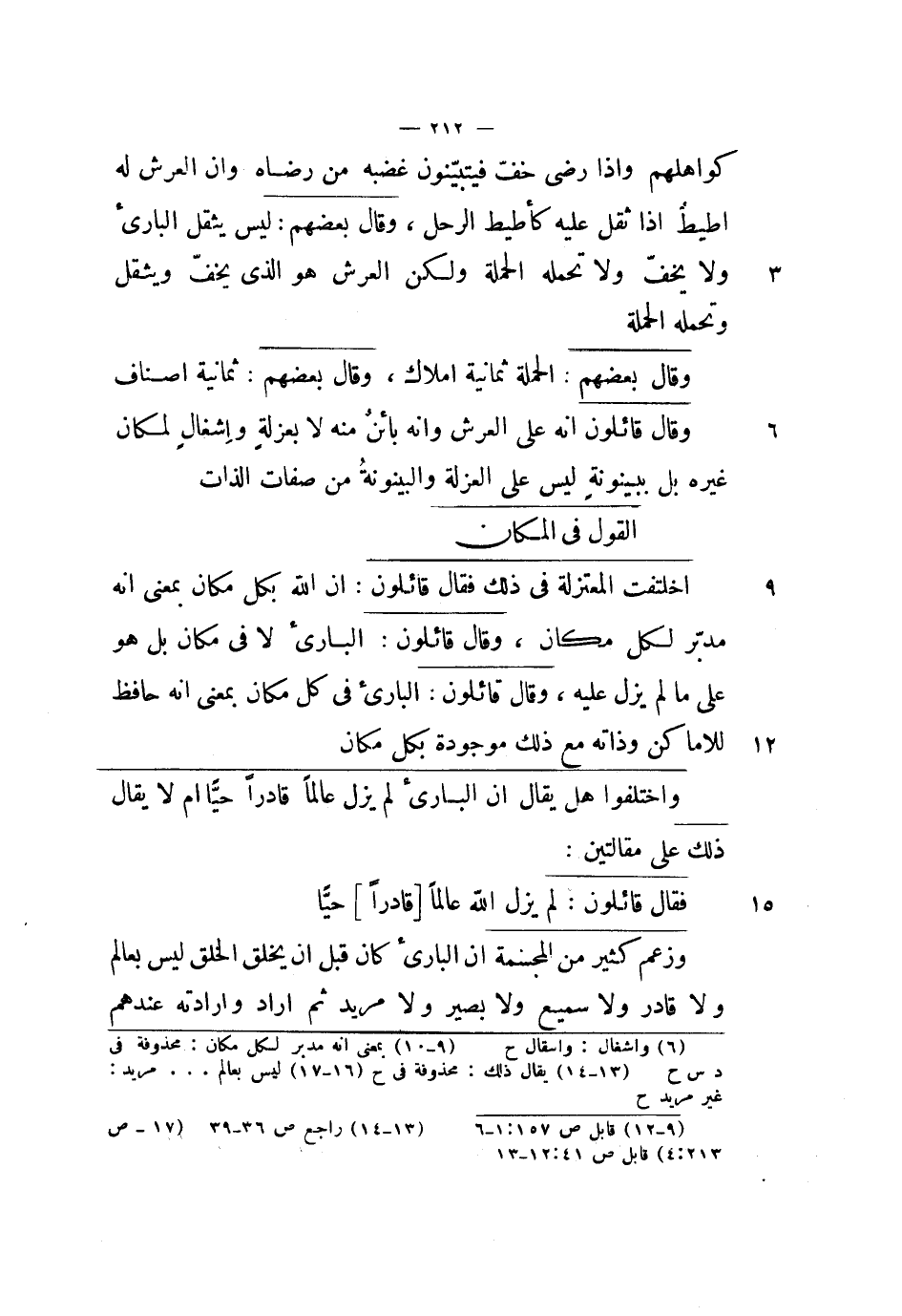 وزعم كثير من المجسمة أن البارئ كان قبل أن يخلق الخلق ليس بعالم ولا قادر ولا سميع ولا بصير ولا مريد ثم أراد وإرادته عندهم