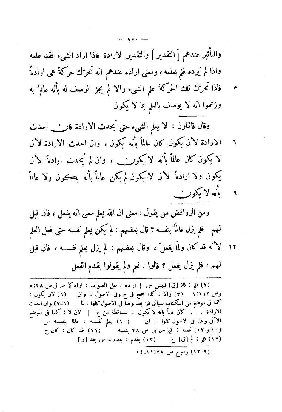 وقال قائلون: لا يعلم الشيء حتى يحدث الإرادة فإن أحدث الإرادة لأن يكون كان عالماً بأنه يكون، وإن أحدث الإرادة لأن لا يكون كان عالماً بأنه لا يكون، وإن لم يحدث إرادة لأن يكون ولا إرادة لأن لا يكون لم يكن عالماً بأنه يكون ولا عالماً بأنه لا يكون.