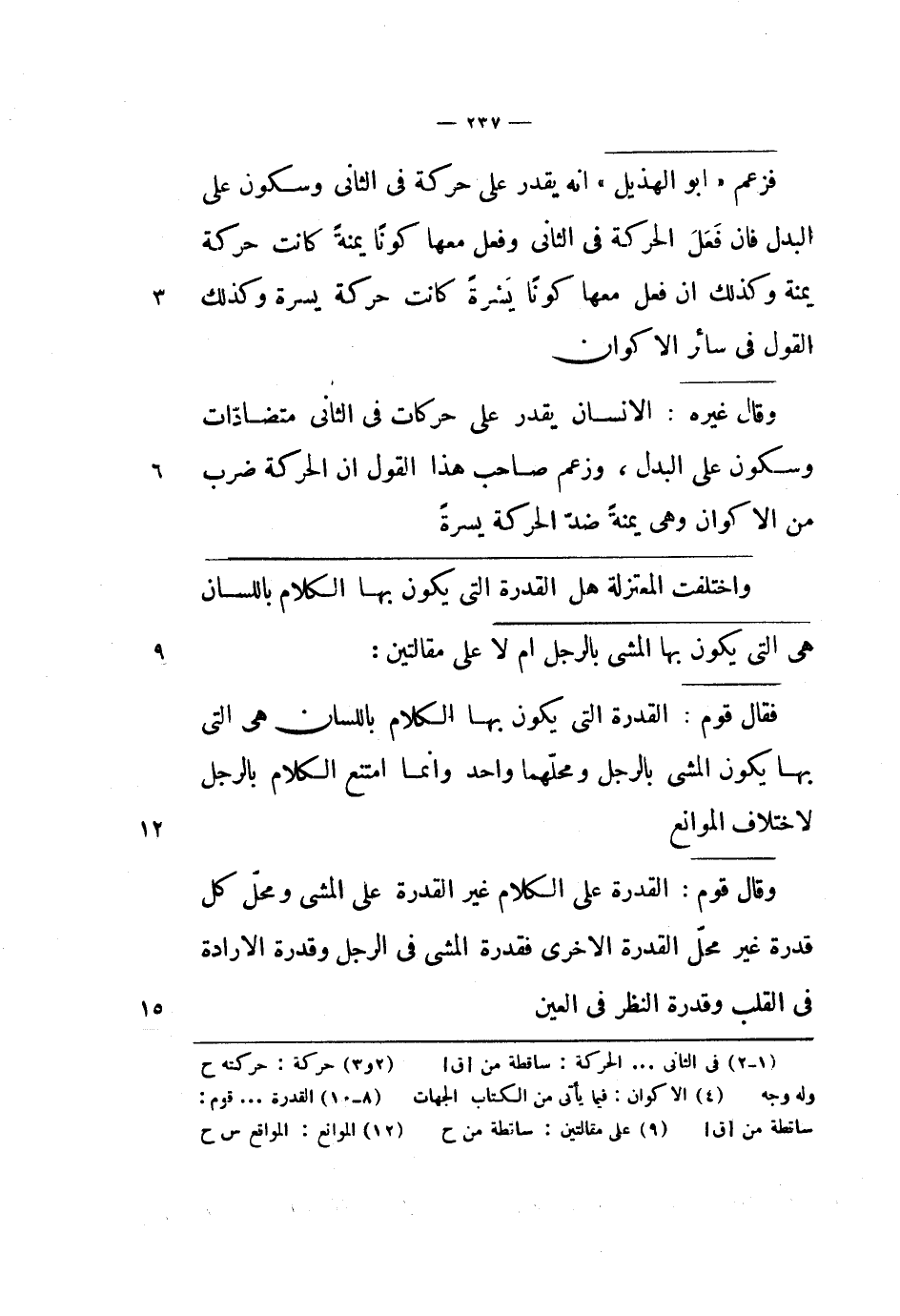 وقال غيره: الإنسان يقدر على حركات في الثاني متضادات وسكون على البدل، وزعم صاحب هذا القول أن الحركة ضرب من الأكوان وهي يمنة ضد الحركة