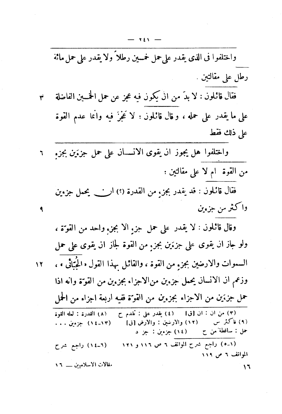 وقال قائلون: لا يقدر على حمل جزء إلا بجزء واحد من القوة، ولو جاز أن يقوى على جزأين بجزء من القوة لجاز أن يقوى على حمل السموات والأرضين بجزء من القوة، والقائل بهذا القول الجبائي، وزعم أن الإنسان يحمل جزأين من الأجزاء بجزأين من القوة وأنه إذا حمل جزأين من الأجزاء بجزأين من القوة ففيه أربعة أجزاء من الحمل.