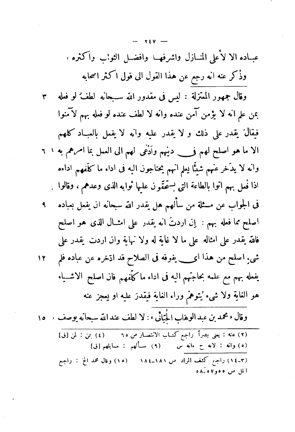 وقال جمهور المعتزلة: ليس في مقدور الله سبحانه لطف لو فعله بمن علم أنه لا يؤمن آمن عنده وأنه لا لطف عنده لو فعله بهم لآمنوا فيقال يقدر على ذلك ولا يقدر عليه وأنه لا يفعل بالعباد كلهم إلا ما هو أصلح لهم في دينهم وأدعى لهم إلى العمل بما أمرهم به وأنه لا يدخر عنهم شيئاً يعلم أنهم يحتاجون إليه في أداء ما كلفهم أداءه إذا فعل بهم أتوا بالطاعة التي يستحقون عليها ثوابه الذي وعدهم، وقالوا في الجواب عن مسألة من سألهم هل يقدر الله سبحانه أن يفعل بعباده أصلح مما فعله بهم: إن أردت أنه يقدر على أمثال الذي هو أصلح فالله يقدر على أمثاله على ما لا غاية له ولا نهاية وإن أردت يقدر على شيء أصلح من هذا أي يفوقه في الصلاح قد ادخره عن عباده فلم يفعله بهم مع علمه بحاجتهم إليه في أداء ما كلفهم فإن أصلح الأشياء هو الغاية ولا شيء يتوهم وراء الغاية فيقدر عليه أو يعجز عنه.