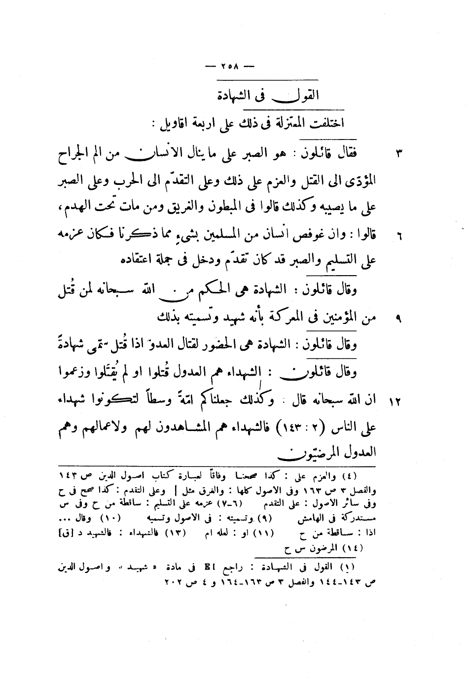 فقال قائلون: هو الصبر على ما ينال الإنسان من ألم الجراح المؤدي إلى القتل والعزم على ذلك وعلى التقدم إلى الحرب وعلى الصبر على ما يصيبه وكذلك قالوا في المبطون والغريق ومن مات تحت الهدم، قالوا: وإن غوفص إنسان من المسلمين بشيء مما ذكرنا فكان عزمه على التسليم والصبر قد كان تقدم ودخل