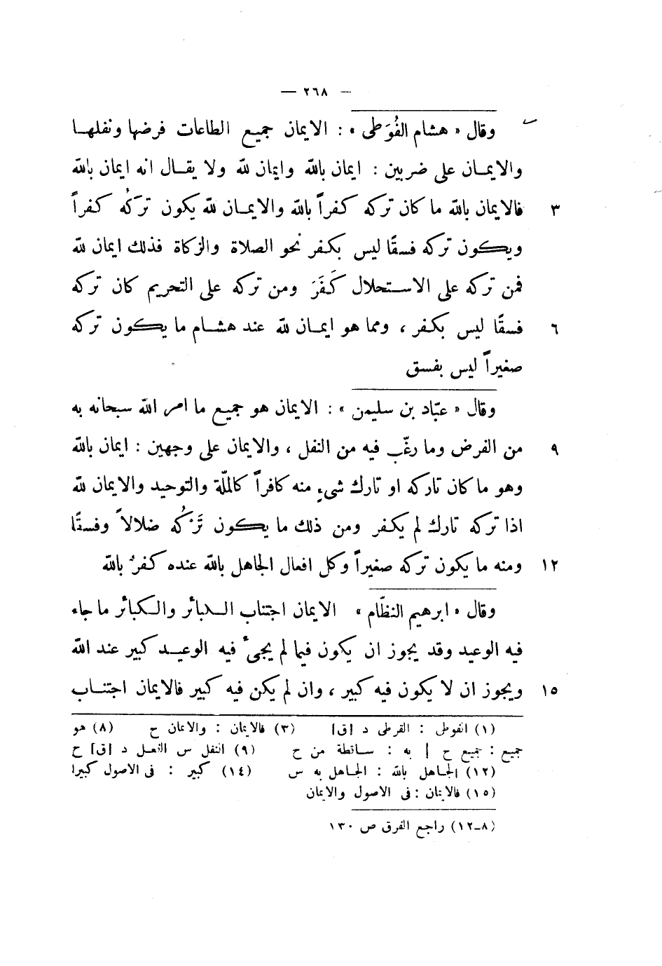 وقال هشام الفوطي: الإيمان جميع الطاعات فرضها ونفلها والإيمان على ضربين: إيمان بالله وإيمان لله ولا يقال أنه إيمان بالله فالإيمان بالله ما كان تركه كفراً بالله والإيمان لله يكون تركه كفراً ويكون تركه فسقاً ليس بكفر نحو الصلاة والزكاة فذلك إيمان لله فمن تركه على الاستحلال كفر ومن تركه على التحريم كان تركه فسقاً ليس بكفر، ومما هو إيمان لله عند هشام ما يكون تركه صغيراً ليس بفسق.