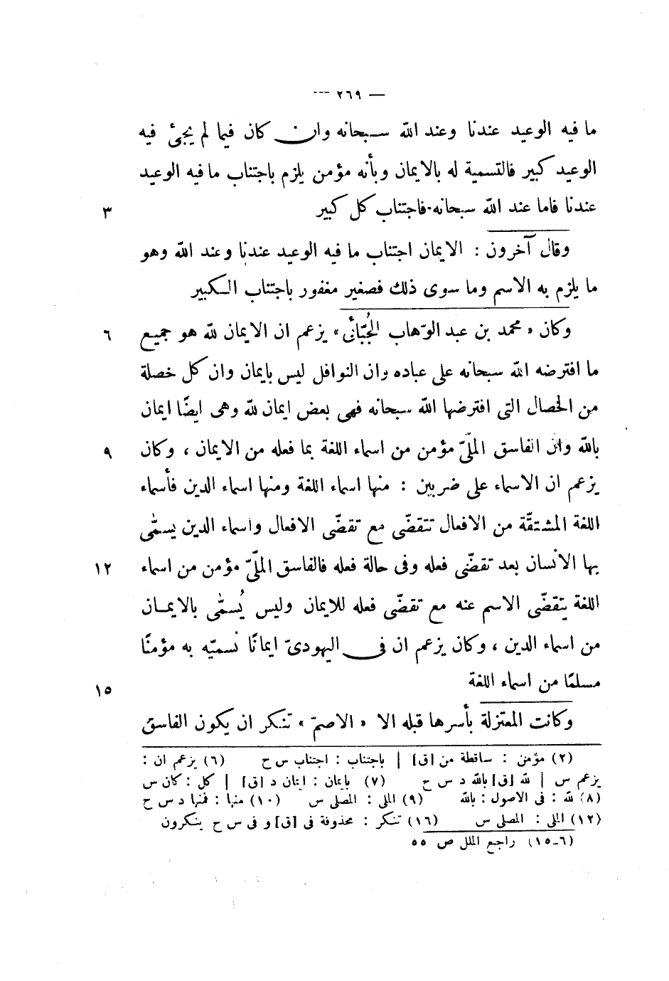 وكان محمد بن عبد الوهاب الجبائي يزعم أن الإيمان لله هو جميع ما افترضه الله سبحانه على عباده وأن النوافل ليس بإيمان وأن كل خصلة من الخصال التي افترضها الله سبحانه فهي بعض إيمان لله وهي أيضاً إيمان بالله وأن الفاسق الملي مؤمن من أسماء اللغة بما فعله من الإيمان، وكان يزعم أن الأسماء على ضربين: منها أسماء اللغة ومنها أسماء الدين فأسماء اللغة المشتقة من الأفعال تتقضى مع تقضي الأفعال وأسماء الدين يسمى بها الإنسان بعد تقضي فعله وفي حالة فعله فالفاسق الملي مؤمن من أسماء اللغة يتقضى الاسم عنه مع تقضي فعله للإيمان وليس يسمى بالإيمان من أسماء الدين، وكان يزعم أن في اليهودي إيماناً نسميه به مؤمناً مسلماً من أسماء اللغة.