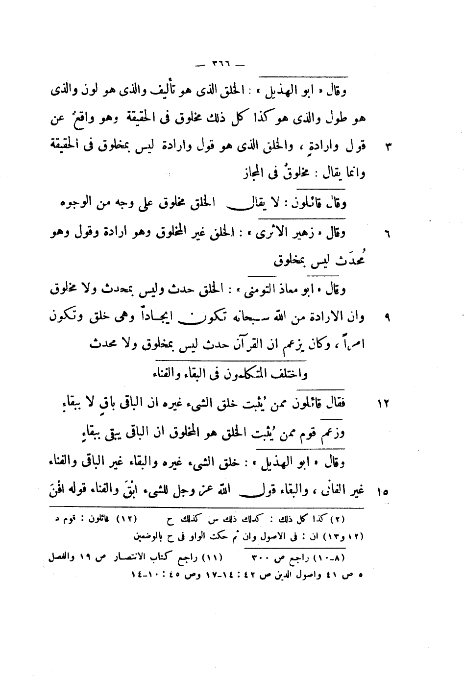 وقال أبو الهذيل: الخلق الذي هو تأليف والذي هو لون والذي هو طول والذي هو كذا كل ذلك مخلوق في الحقيقة وهو واقع عن قول وإرادة، والخلق الذي هو قول وإرادة ليس بمخلوق في الحقيقة وإنما يقال: مخلوق في المجاز.